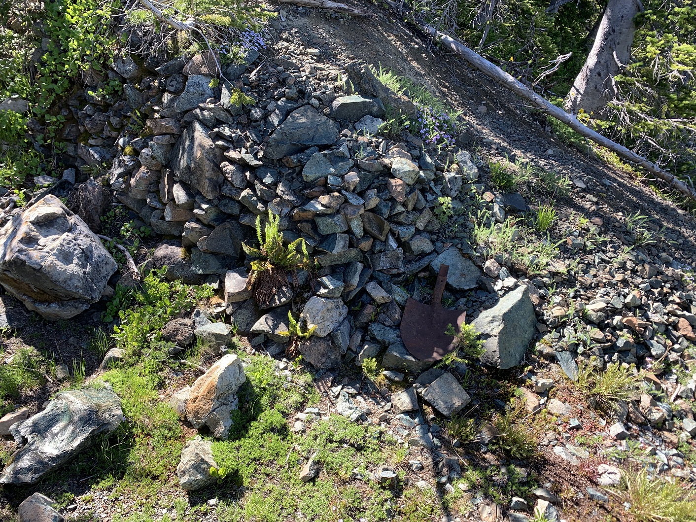 Camping at the TH on Saturday night allowed a relatively early start at 6:50 AM.  By 8:30 AM we were at Paddy Go Easy Pass, having gained 2,800 feet in 2.8 miles.  From the Pass to Sprite Lake, a lovely gem of an alpine lake set against the impressive background of The Cradle, the trail becomes a boot beaten path.  Beyond Sprite Lake, the remainder of the trip is on steep, rocky and sometimes loose terrain.  Route finding is relatively easy in the generally open terrain.  It took us 4 1/2 hours to reach the summit from the TH.  We wasted close to an hour going around the west slope of the "West Summit", and then up and over it.  Along this section, we found signs of a small mining operation, with a rusty old shovel laying near an obviously built up retaining wall.  Reaching the "West Summit" necessitated down scrambling on loose and somewhat exposed rock, to reach the correct Col.  The key to the easiest ascent of Tacquala Peak is getting to the correct Col between the "West Summit" (6,740 feet) and the "Central Summit" (6,680 feet).  Location of this point is: 47.5348, -121.0463.  It is shown on the Route Map, attached to report, as a blue diamond.  It looks very unappetizing from a distance, being a steep scree and loose rock slope.