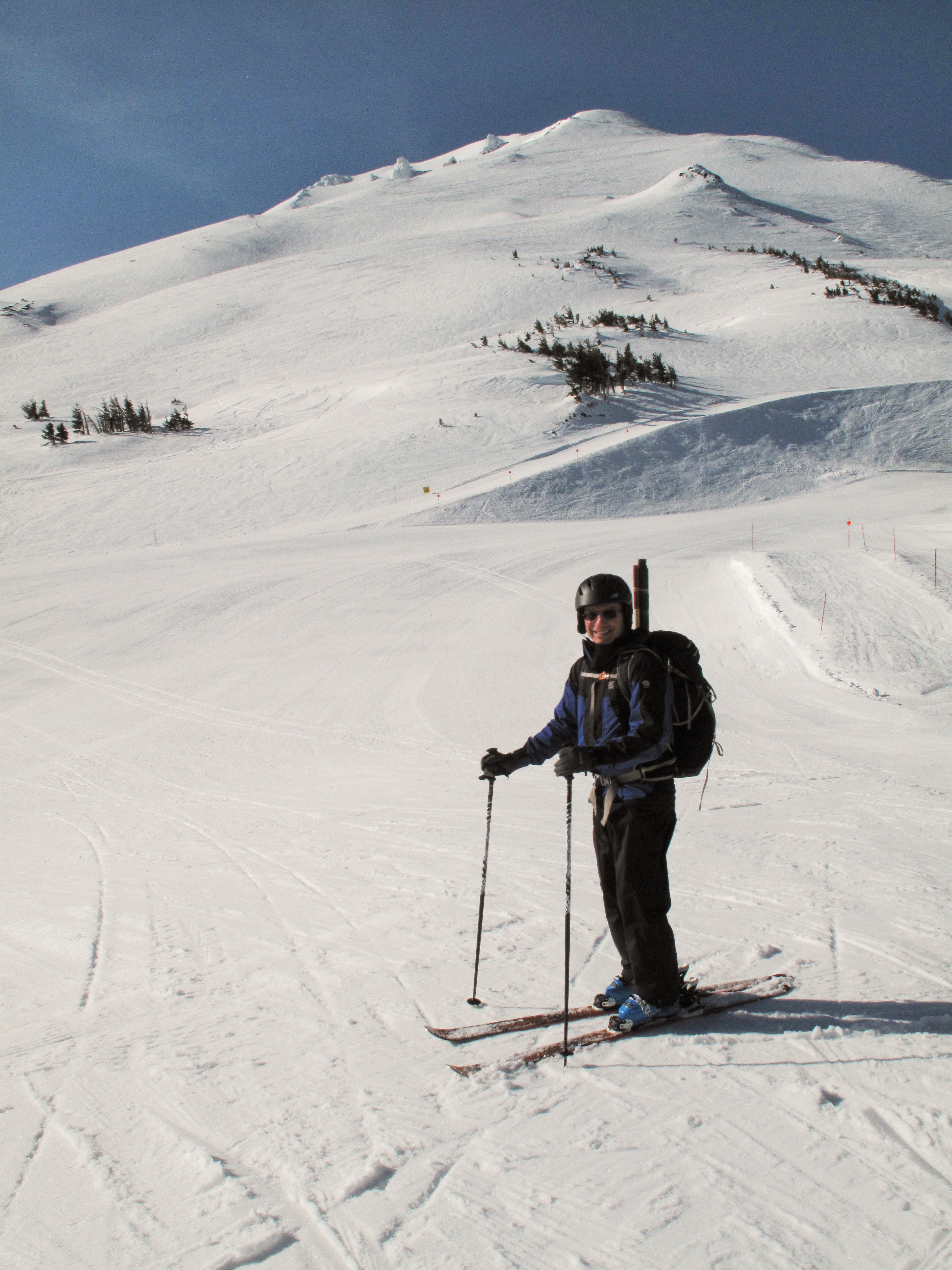 Mount Bachelor, W7O/CM-005, is a 10 point SOTA Summit in Central Oregon, near the city of Bend. Access is relatively easy, any time of year. This is because Mount Bachelor, a Strata Volcano of 9,065 elevation, is also a 58+ year old Alpine Ski Resort. During the Ski Season, it is possible to ride the “Summit Lift” to within ¼ mile and 110 vertical feet of the true summit. Other times of year, after skiing is done, Mount Bachelor can be a pleasant snow hike, or a regular trail from the base facilities at about 6,300 feet elevation. Alternatively, the Summit Lift operates during the summer months, to whisk tourist to the top in minutes. As we had purchased Spring Season Ski Passes, I decided to activate via the summit lift, and ski down. This would give me a 2,765 foot ski run!