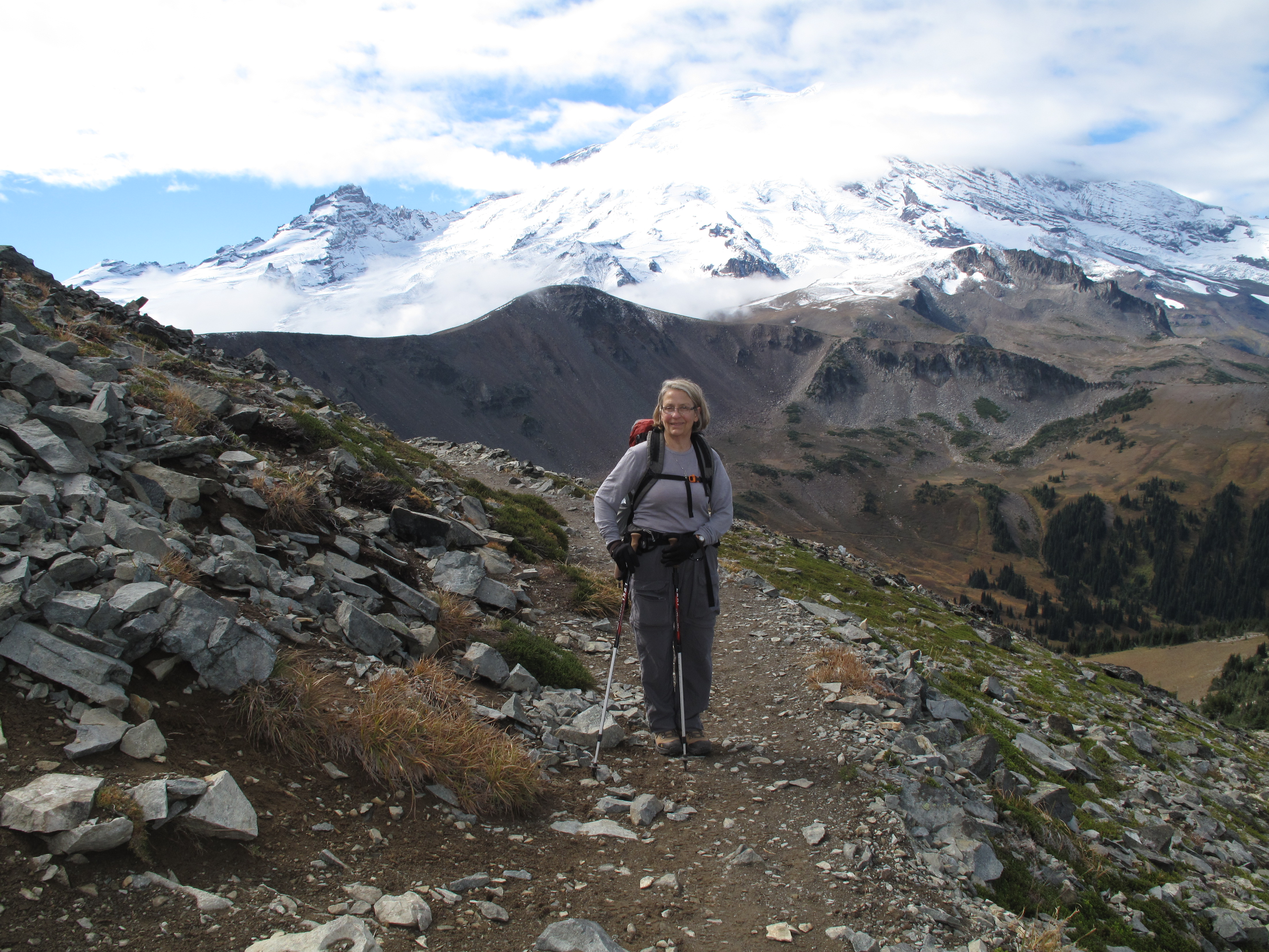 Upon reaching the summit, I found the goats in close proximity, so I decided to try 2M FM, despite the fact that I had my full HF rig & antenna with me at the summit. I made 5 contacts in about 25 minutes, while my wife kept a wary eye on the goats. As the herd was edging closer to the summit, and not being sure of their intentions or disposition, I made a hasty retreat down to the trail. My movements made the herd a little jumpy. Rather than head back up to the summit, we decided to hike around elsewhere, and headed out towards Frozen Lake and Burroughs Mountain(s). By then we had occasional glimpses of Mount Rainier, and surrounding areas, and so were satisfied with that. I hope to return for a more liesurly Activation, and try HF from the summit.