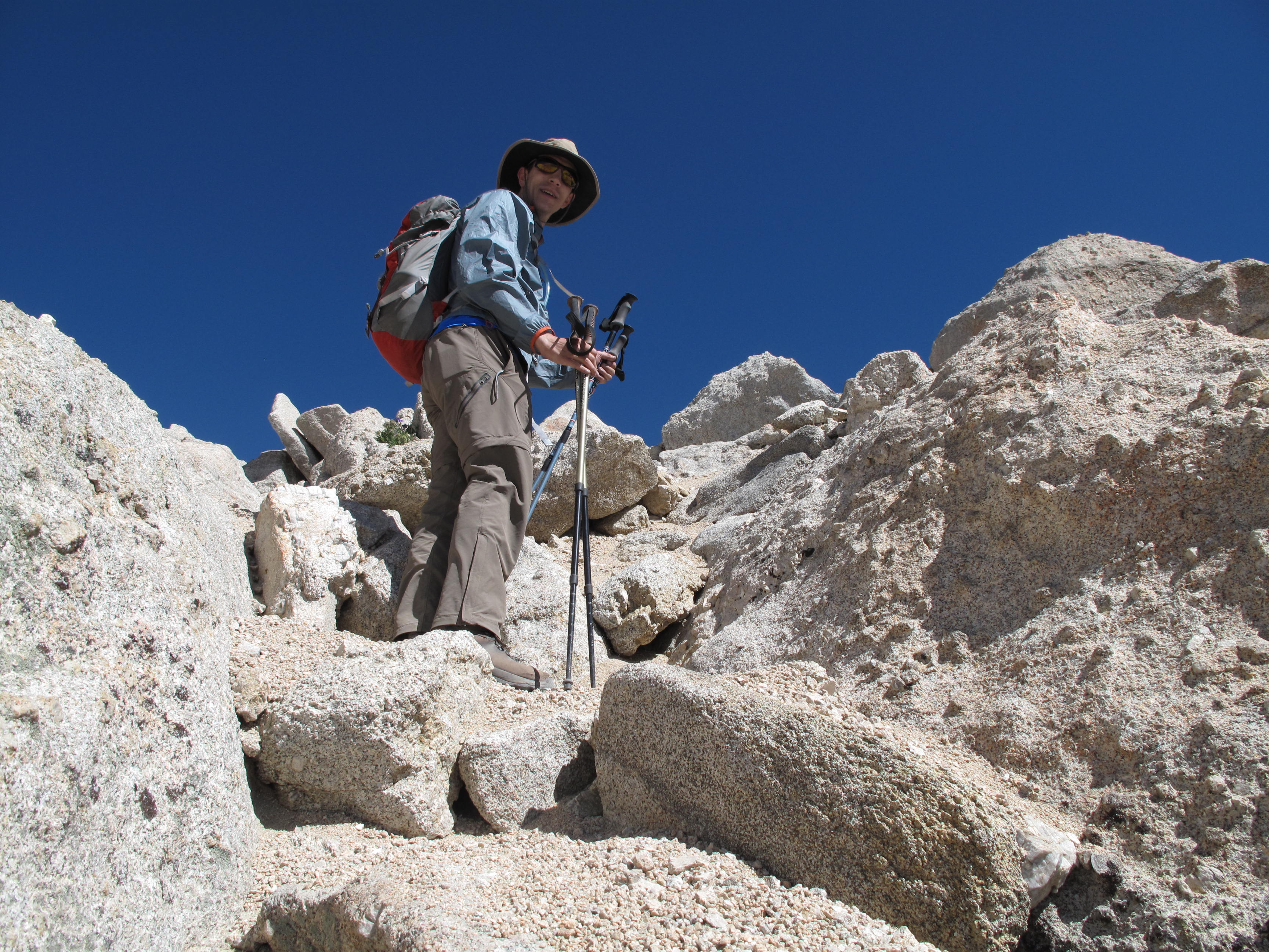 Day 3, hike / scrabmle up Mount Langley, 14,042 feet. This route was 11.5 miles round trip, and 3,700 feet elevation gain. The climb involved going back over "New Army Pass", at 12,230 feet. Then you need to drop 400 feet elevation and re-gain it, before continuing to summit of Mount Langley. The final summit section route we chose is the "3rd Class Variation", climbing over a very nice steep section of large and medium size granite boulders to gain the summit plateu, and then the summit. On the way back to camp, through New Army Pass, we again had to re-gain the 400 feet previously dropped. All together we saw 4 other people on the peak that day.