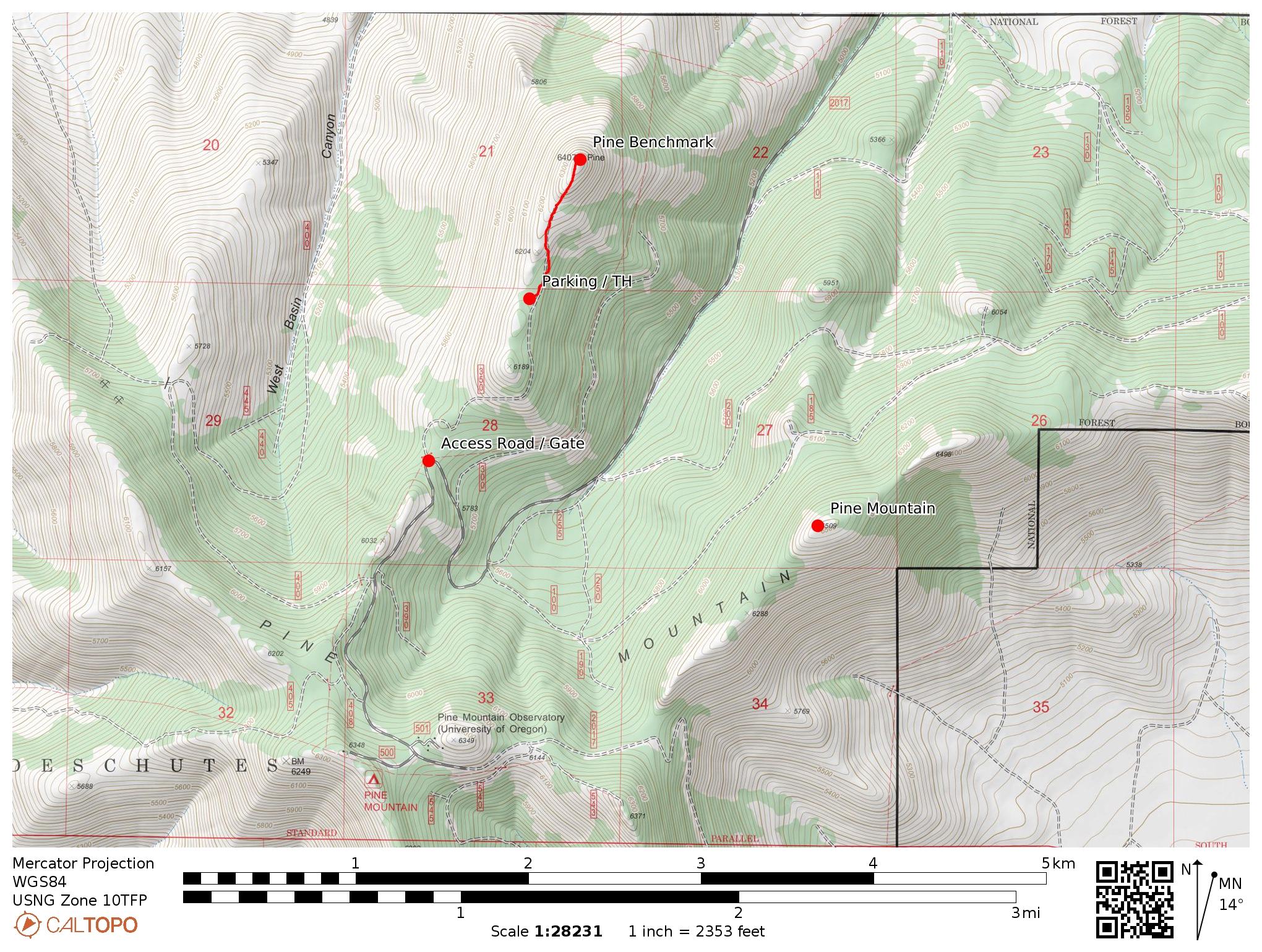 Pine Benchmark, 6,407 feet, is in close proximity to Pine Mountain. However, the two mountains are separated by a 1,200 foot deep valley, wherein lies the access road (FS 2017) to the Pine Mountain Observatory complex. This makes it necessary to drive to the access road (FS350) leading towards the base of Pine Benchmark. This road, FS350, is used to reach the vicinity of the Paragliding takeoff location, at the summit of Pine Benchmark.