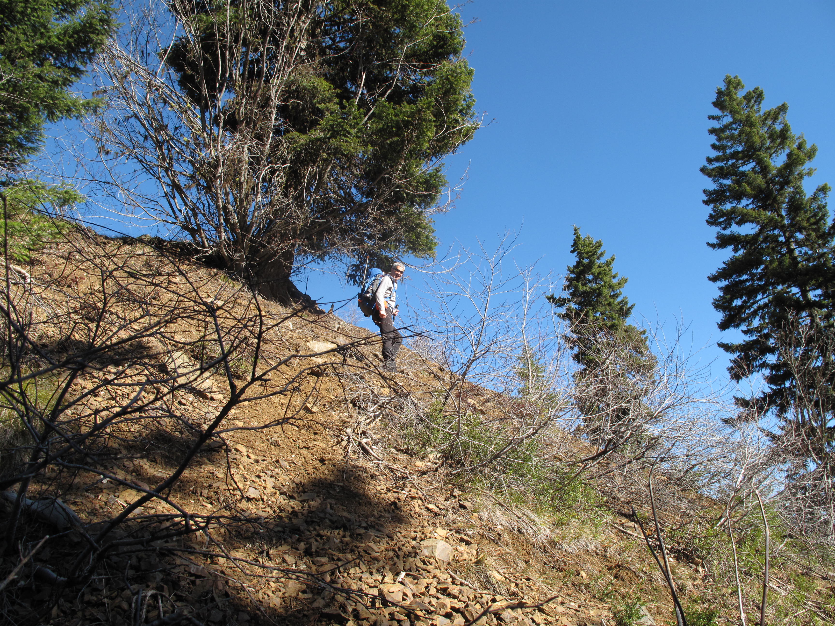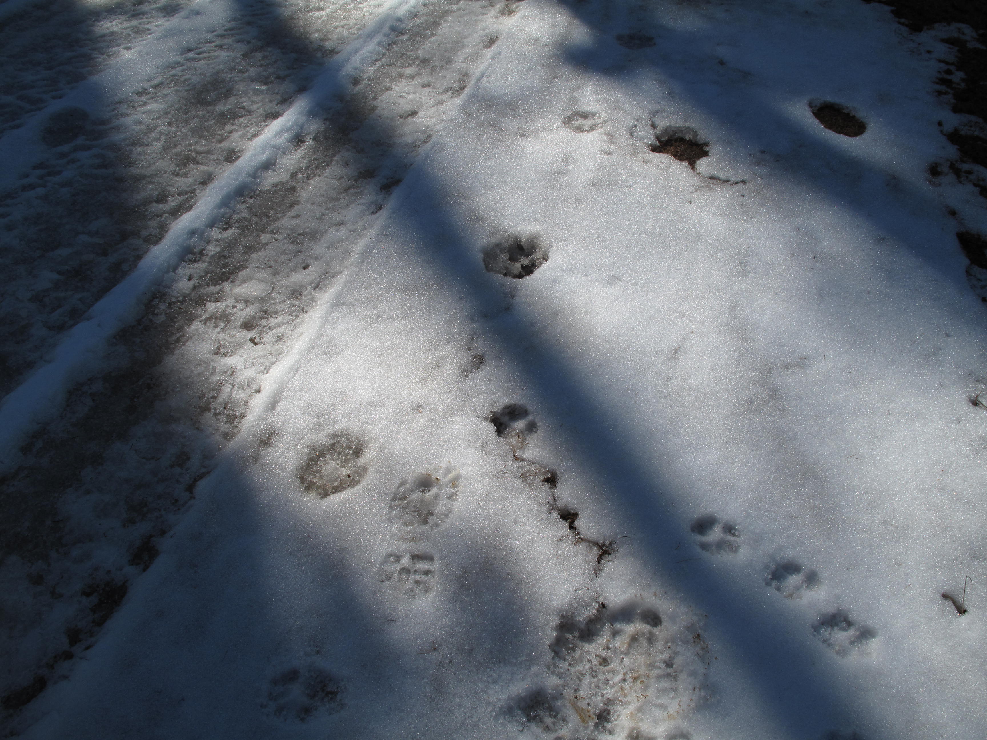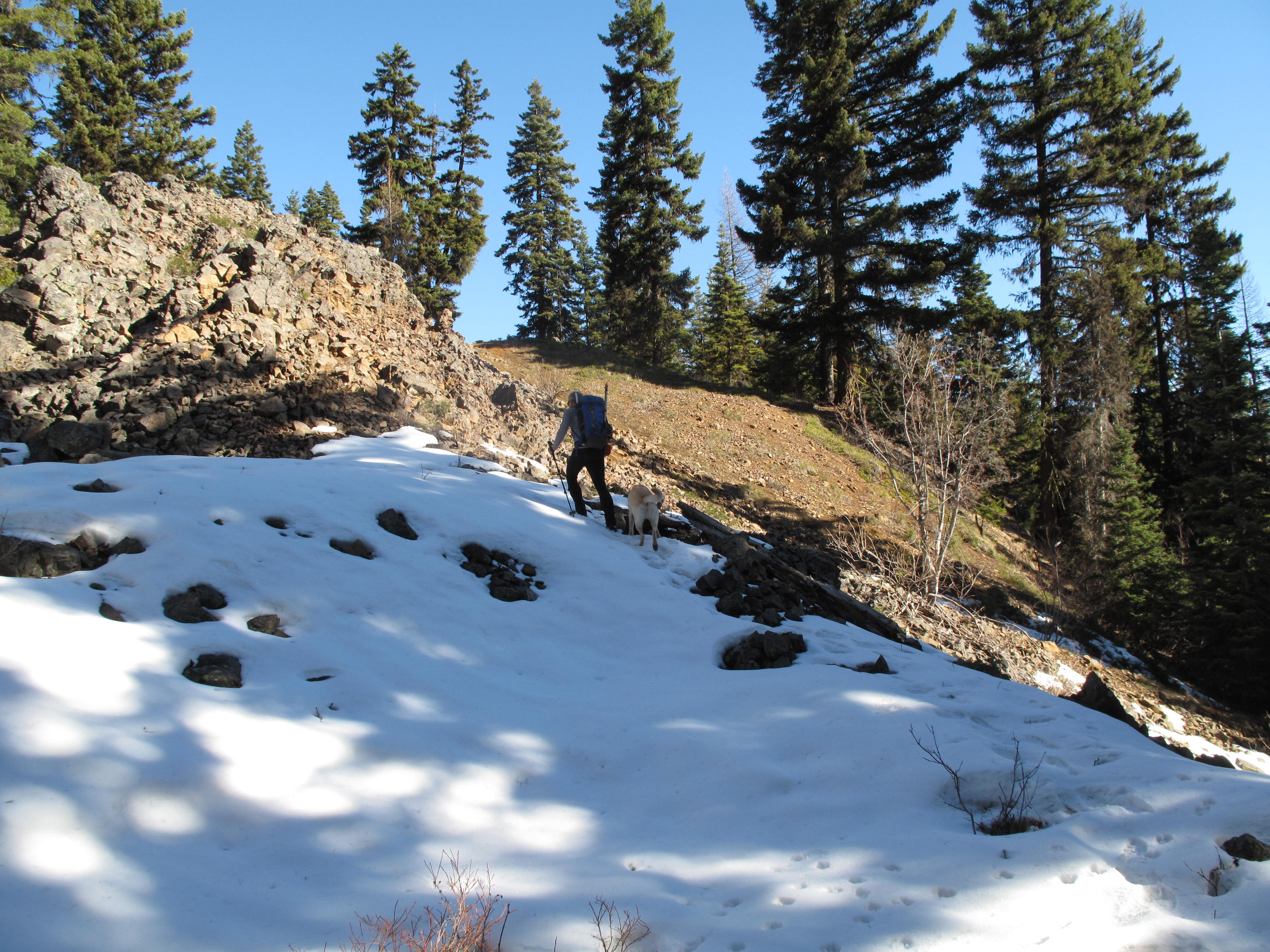 Red Top Lookout is accessible off Forest Service Roads: #9738 then #9702, from SR-97, the Cle Elum to Leavenworth State Road traversing Blewett Pass. We managed to drive FR# 9702 to an elevation of 4,360 feet +/-. Not wanting to risk the increasingly deeper snow on the north and east facing and shadowed gravel road, we parked the car and headed up. We stayed on FR #9702 southbound for a bit, then took a northbound stub logging road, identified as FR 644 on the 2003 vintage USGS map I used for research. Once #644 petered out we traveled cross country over mixed snow, talus and open forest NNW towards the Teanaway Ridge crest. We gained #9702 again, and stayed on road / trail northbound the rest of the way to the summit. The round trip distance was 3.5 miles, with an elevation gain of 1,000 feet. Towards the summit rock formation, we started seeing feline paw prints in the snow. They were so large, that at first we mistook them for bear tracks. Upon closer examination, we could clearly see the pads and claw marks indicating a BIG CAT! See pictures below. We felt the tracks were probably a few days old, as it has not snowed in the area for approximately 9 days. The tracks were huge, and probably those of a Cougar: http://en.wikipedia.org/wiki/Cougar. Even though Dexter the SOTA Dog is about 92 lbs., he would be no match for a mature Cougar. Luckily, all we saw of the Cougar was the paw prints. We did see plenty of evidence of recent deer, elk and other animal passages of Teanaway Ridge on our route through the mud and snow.