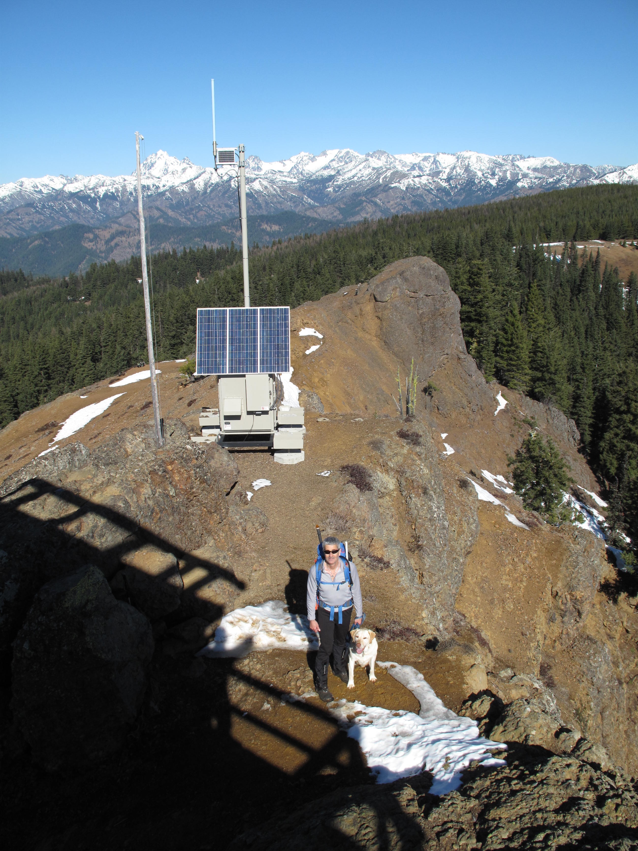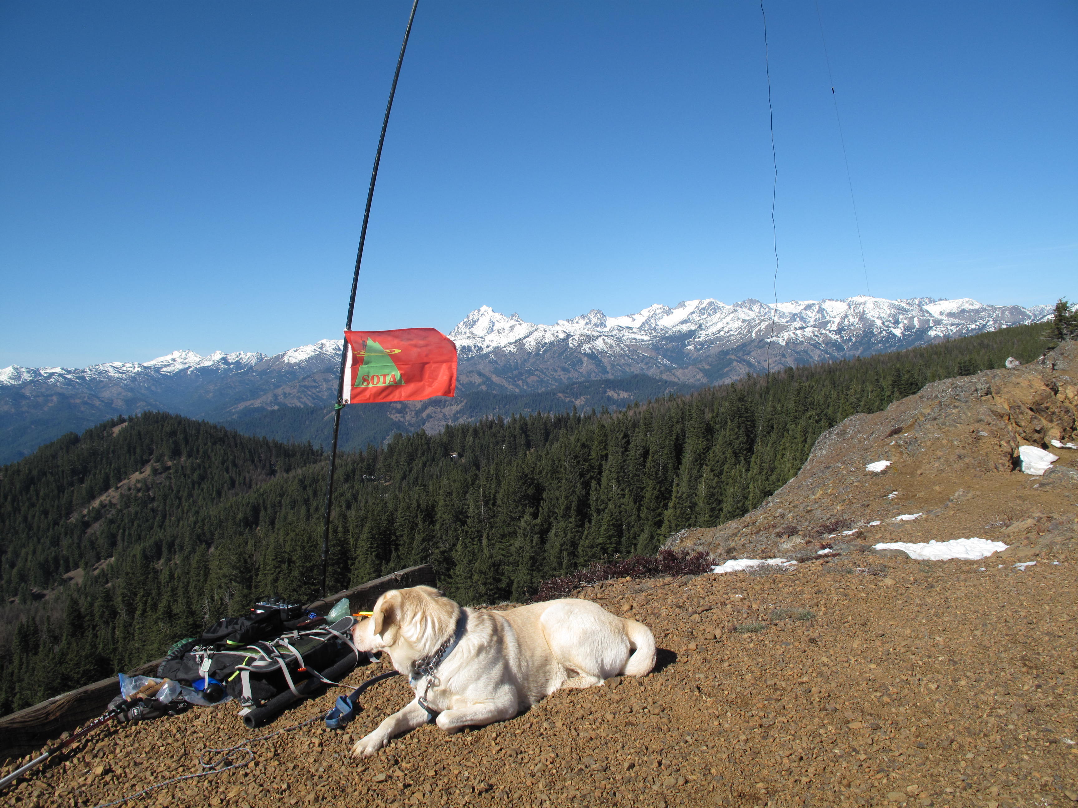 Winter Activation of Red Top Mountain Lookout together with Tim Nair, KG7EJT. Red Top Mountain Lookout is 5,361 feet elevation (1,634 meters), and is located approximately 15 miles NNE of Cle Elum, Washington. There have been several activations of Red Top Mountain before, but none in winter. Great weather, very manageable snow, great views and good company, including Dexter the SOTA Dog, made for a fine activation!