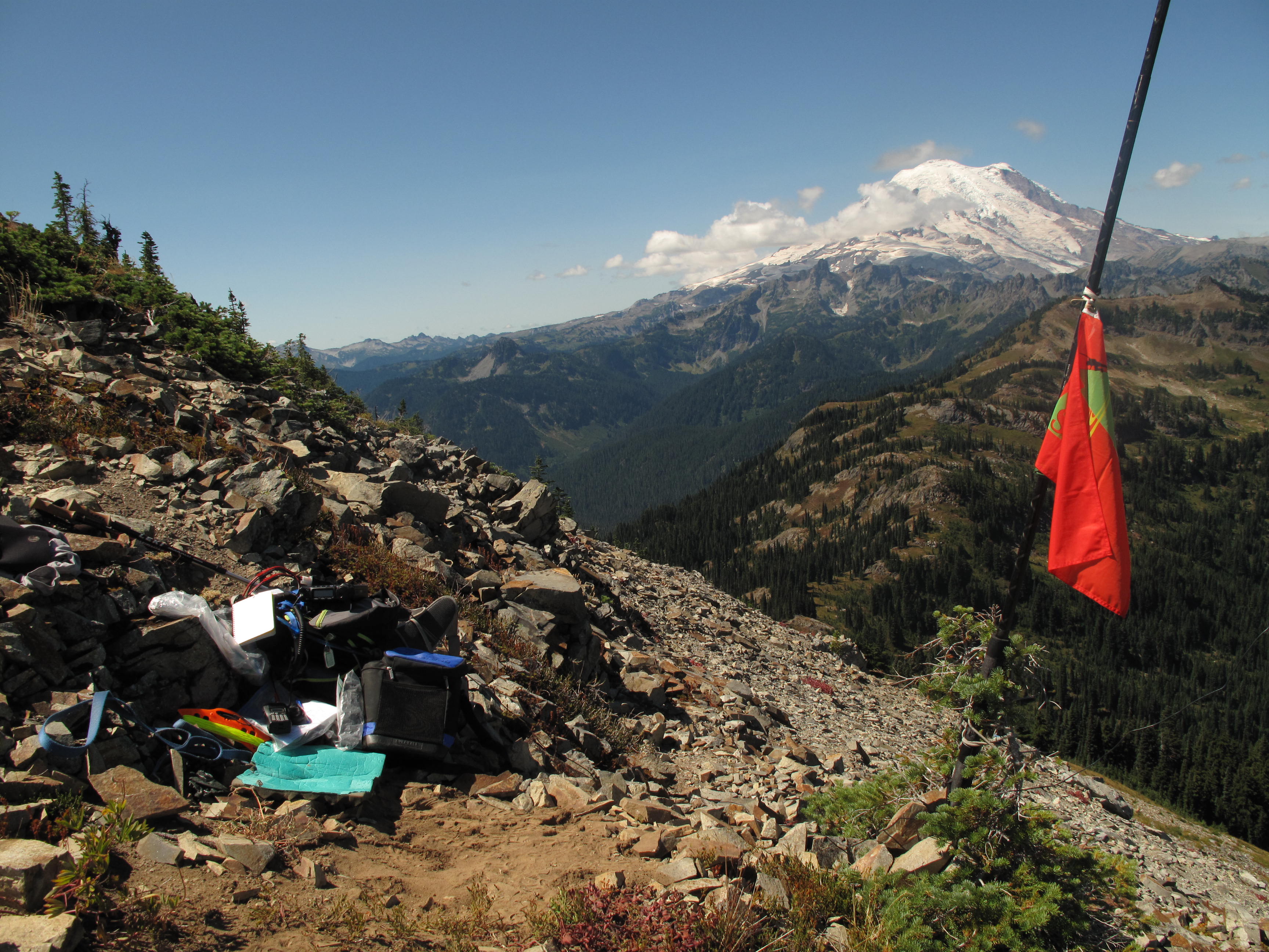 The views from the summit were amazing: dominant Mount Rainier's east face, south to Mount Adams and Goat Rocks, SW to squat Mount Saint Helens and hundreds of other peaks near and far with a 360 degree vista all around.