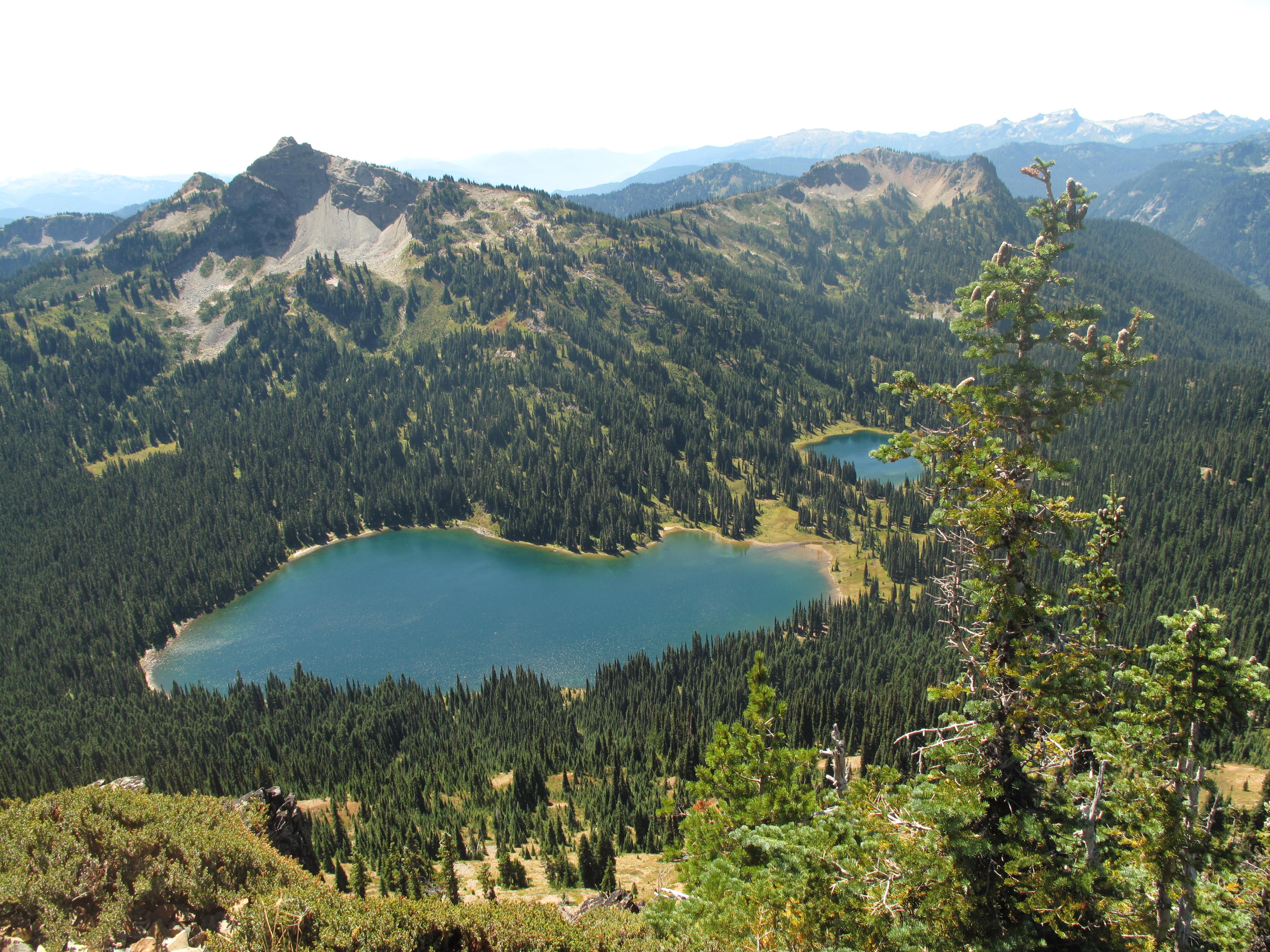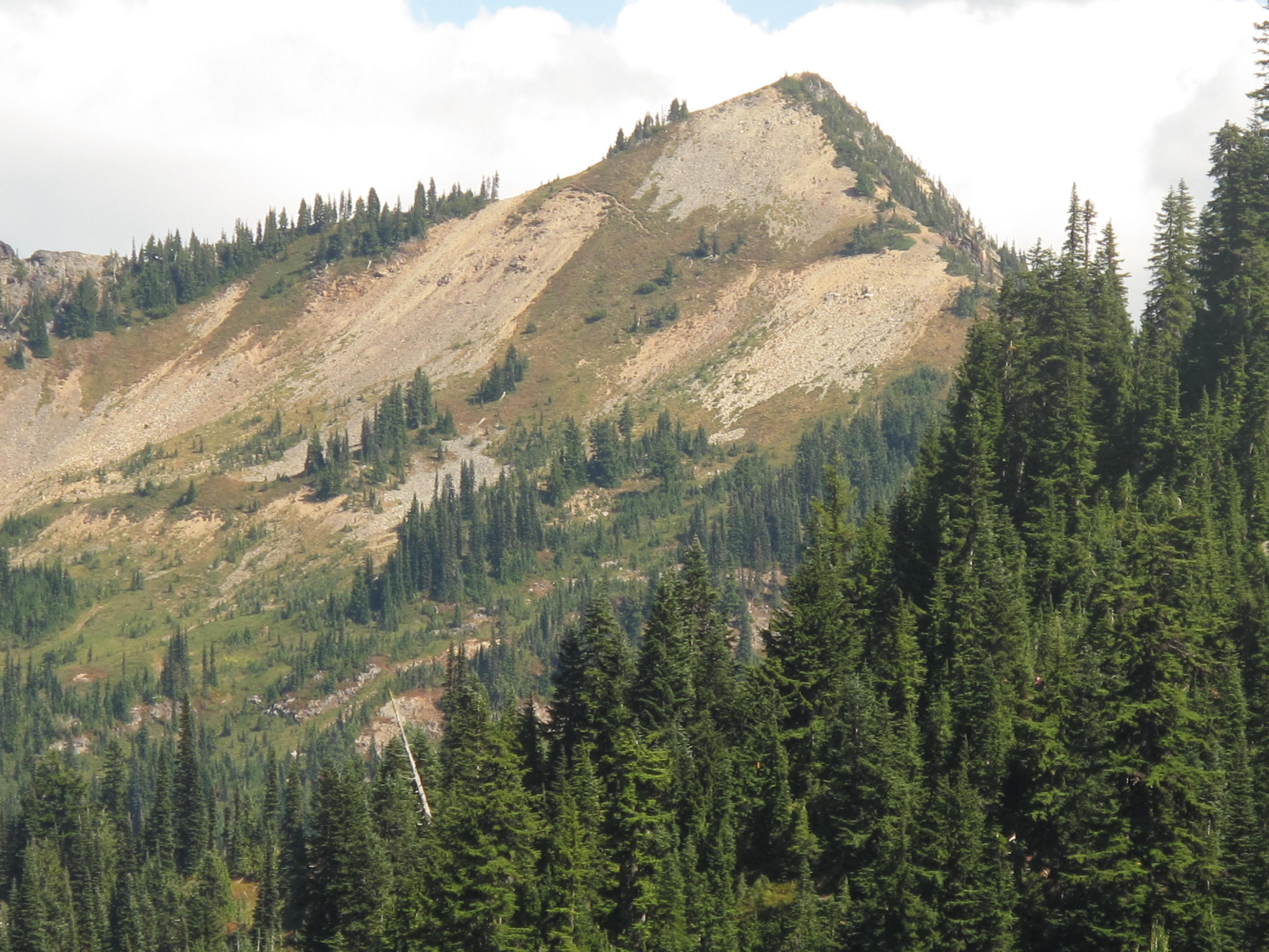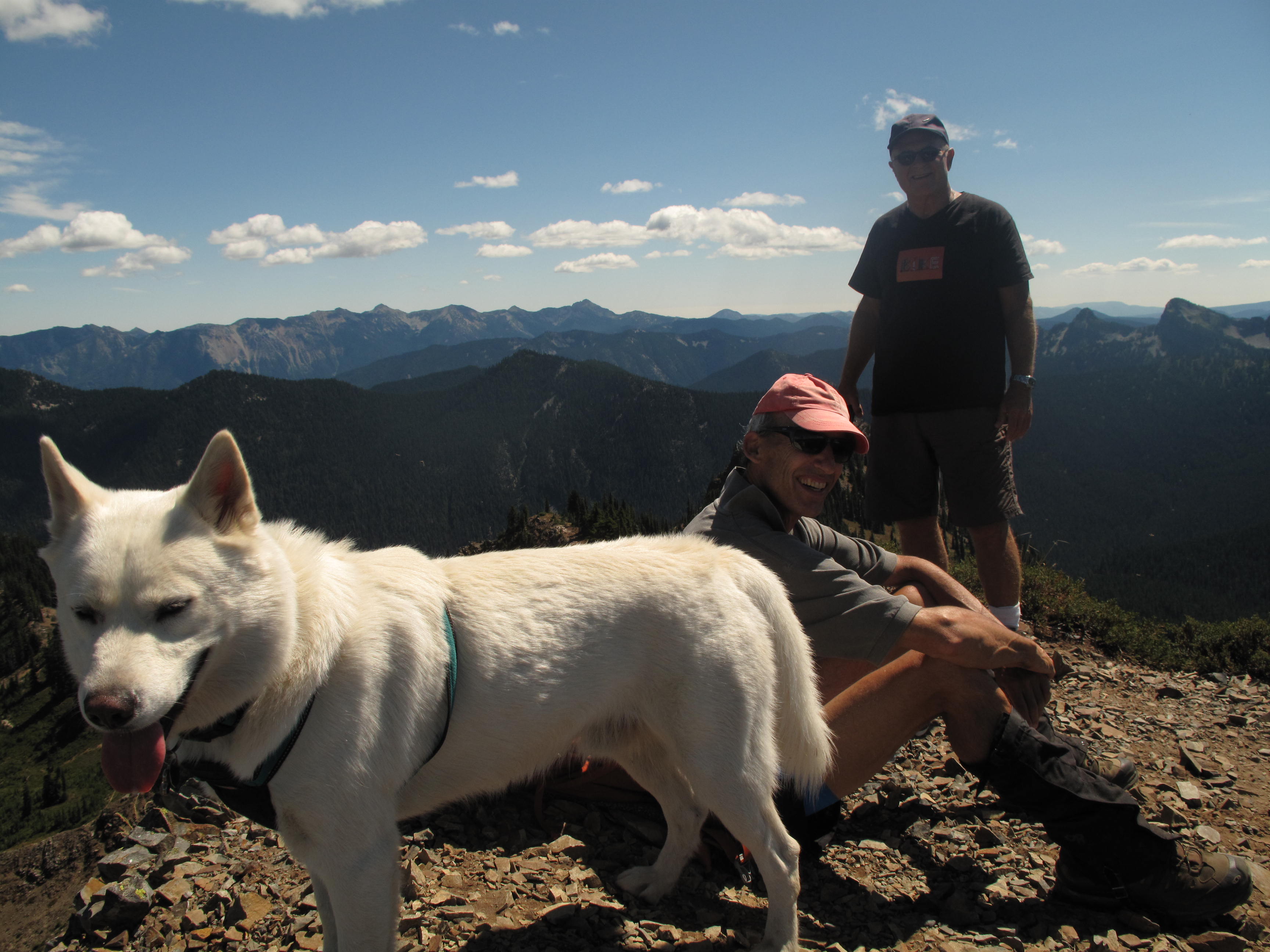 On a beautiful Sunday morning we departed the TH at Chinook Pass at approximately 9:00 AM, just ahead of the hordes of hikers that would be on the PCT / Naches Peak Loop later in the day. The recent thunderstorms, rain and wind cleared out much of the haze that would otherwise have filtered over from the fires raging in various eastern parts of the state at this time. We made quick work of the PCT portion of the route, despite the dogs taking a swim in a little pond along the way. We reached the obvious XC route beginning, turning almost due east towards Tahtlum Peak, in short order. This point is just east of point 6,046 on the map. Despite the previous reports describing circumventing on the south the two "bumps" along the ridge trending towards the base of Tahtlum Peak, we decided to go up and over them. From the top of the second "bump" we had to drop 210 feet on a steepish rotten slope between the cliff bands. Not too difficult, but easily avoided by travelling a little to the south, below the "bumps". From the low spot on the ridge, we ascended 830 feet on west ridge and then NW face of Tahtlum Peak to the summit. We found the summit as described, a smallish flat gravel area of about 6 X 6 feet, with cliffs on three sides.