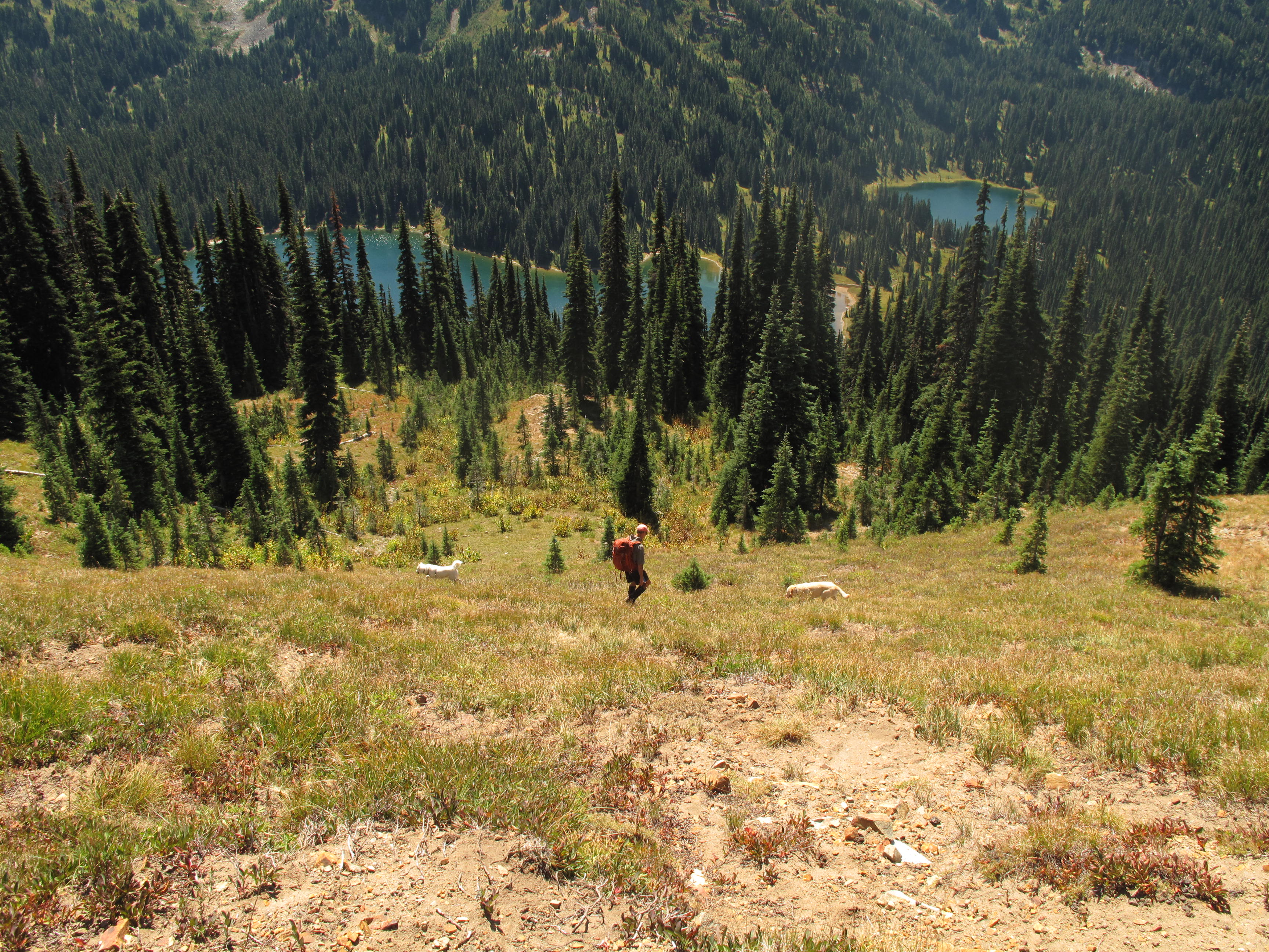 The crystal blue waters of Dewey Lake(s), about 1,440 feet below us, beckoned powerfully on the sun splashed summit, so we decided to go for a swim. Descending from the summit block to the west ridge of Tahtlum Peak, we then dropped about 1,250 feet in about a half mile down the south face of Tahtlum Peak directly to Dewey Lake. There we enjoyed a half hour of swimming in the very "bracing" water. The dogs, especially Dexter the SOTA Dog (being a Labrador Retriever), enjoyed retrieving sticks from the lake. We then climbed out of the lake basin some 730 feet to the junction of PCT and the Naches Peak Loop Trail, where we had taken off XC a few hours before. An uneventful return to the TH along the PCT ensued. On this last stretch of the hike, the expected hordes of hikers were out enjoying the fantastic weather and great views typical of this very popular area.