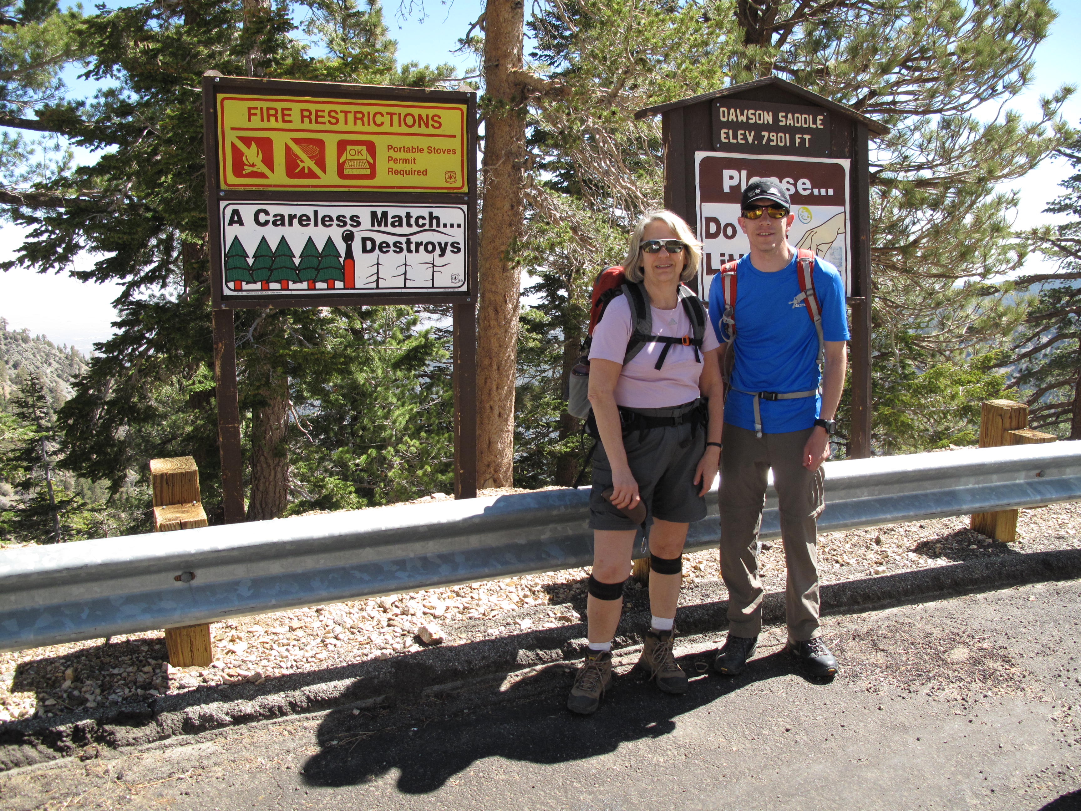 The Trail Head to Throop Peak we chose to use was Dawson Saddle at 7,901 feet elevation. We had two (2) vehicles available, our rental car and my son’s car, as he lives in Southern California. That allowed us to do a car shuttle between trail heads and a one way high level traverse up and over Throop Peak, down to the low point between Throop and Mount Baden Powell, over or around two subsidiary points to the summit of Mount Baden Powell, the subject of a separate report. The total hike is about 10½ miles and a little over 2,500 feet elevation gain, including ups and downs along the Pacific Crest Trail. Throop Peak is named after Amos G. Throop, the founder of Throop University in 1891, now known as California Institute of technology (Caltech), where my son is studying and teaching. Throop Peak is the second highest summit in the group which stretches from Vincent Gap to Islip Saddle. This is a beautiful section of the Pacific Crest Trail and the summit offers an impressive 360 degree view, which includes Mt. Baldy and Mt. Baden-Powell (our next objerctive for the day), the Mojave desert, and on clear days, even the Pacific Ocean. We ended the hike at Vincent Gulch Divide at 6,565 feet elevation.