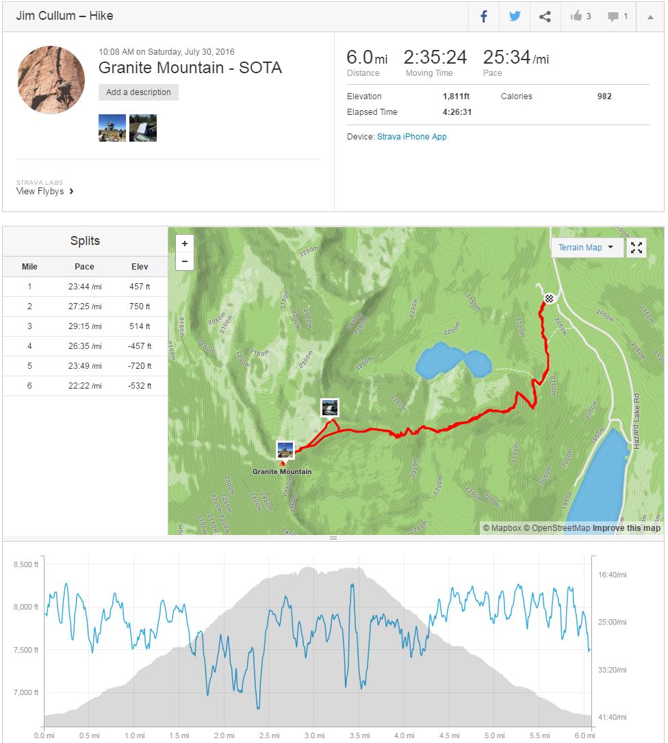 This was my second activation of Granite Mountain which is NW of McCall Idaho.  Although strenuous due to a consistently steep grade, the views from the summit are spectacular.  Granite Mountain has a twin summit.  The trail will take you to the south summit with the fire lookout tower.  This is not the SOTA summit, but is well worth a few extra steps to get the view off the south side.  After a quick visit to the fire lookout, turn back to the north and you will see the slightly higher SOTA summit a short distance away.