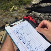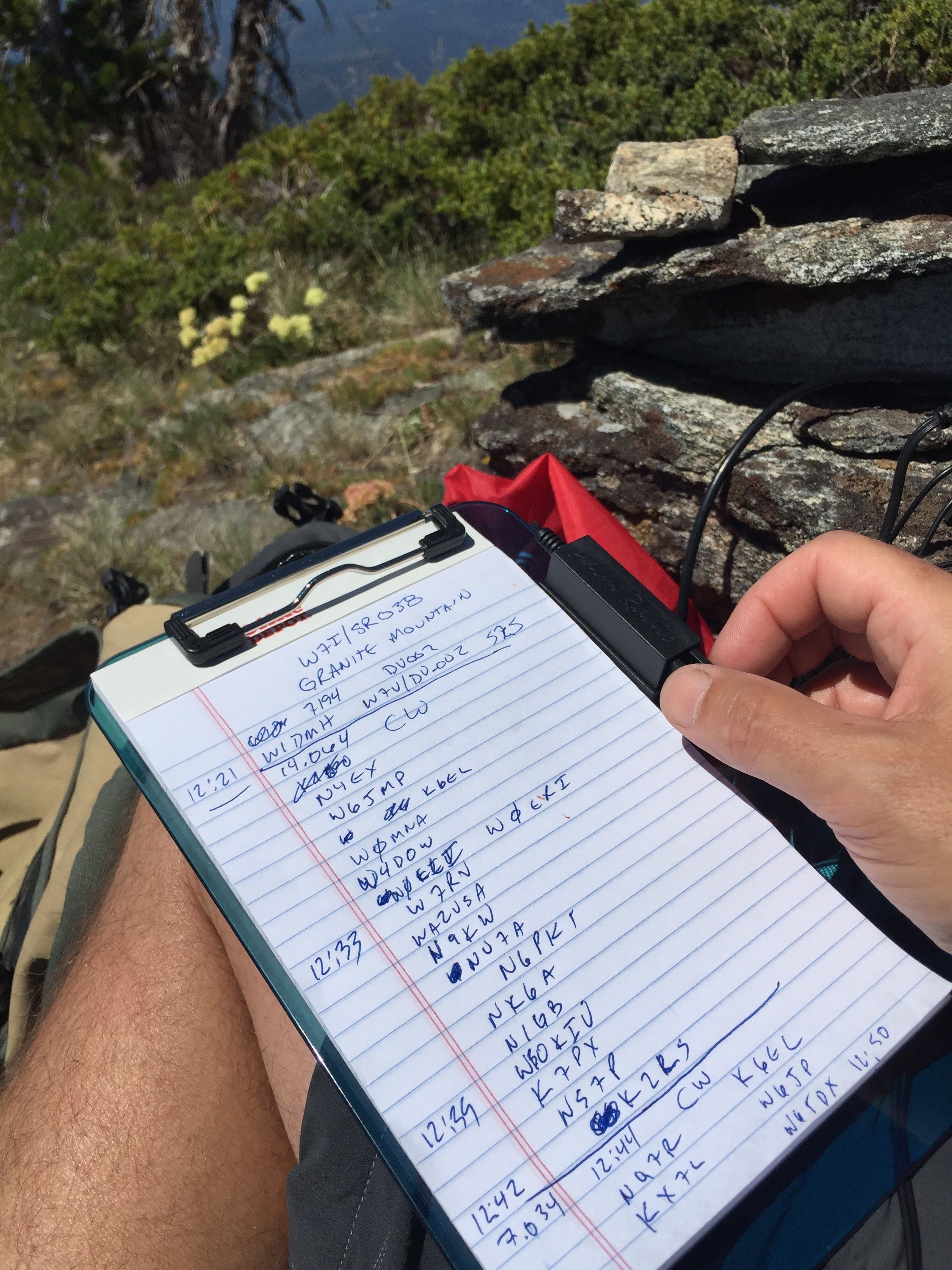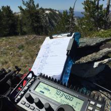 It’s a quick trip down to the saddle then a short bushwack over good ground up to the SOTA summit.  There are a selection of short stumps and snag trees to strap a SOTA pole onto.  Probably can even get away with tossing a wire over the tree just below the summit.  This was another one of my 100% CW summits as I am working on my CW skills.  No problems working all the regular chasers on CW.  I made a quick trip to 20M SSB, but no takers.  20M and 40M CW was enough to put quite a few in the log.  This was also the maiden voyage of my clipboard paddle holder.  Found inspiration on the web for this, but basically just a couple metal washers double-stick taped to the clip board to hold the tiny, but awesome pico paddle from Palm.