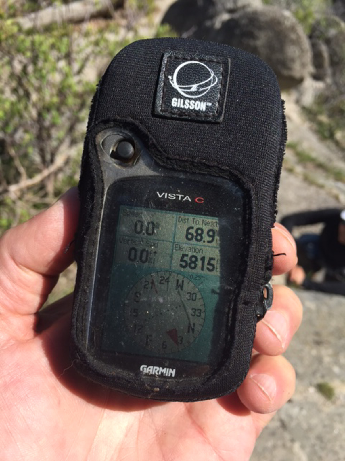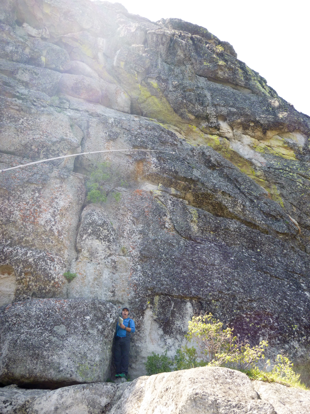 The second choice was to find a spot on either side of Stack Rock that was within the 80 ft activation zone required by the Idaho rules.  From topo maps and by eyeing it up in person, it appeared the south side was greater than 80ft from the top.  This is the side you will first approach from the trail and is the side where the scramble to the top is.  We really wanted to find a spot where future non-climber activators could access and re-activate the summit, so we circumnavigated the summit and found that the north shoulder was higher.  This was confirmed on the topo maps and a reading of 5815 ft on my GPS matched what Google Earth said it should be over there.  5815 was exactly 80ft shy of the summit.  To further verify the activation zone I held up my 30ft pole to estimate the distance to the top.  It appeared that 2 pole lengths and another 20ft was just about right to reach the summit.  So we were pretty confident this shoulder was within the activation zone.  However, to give us a little leeway, I set the KX3 up ontop of a 8ft boulder to put me firmly in the activation zone.