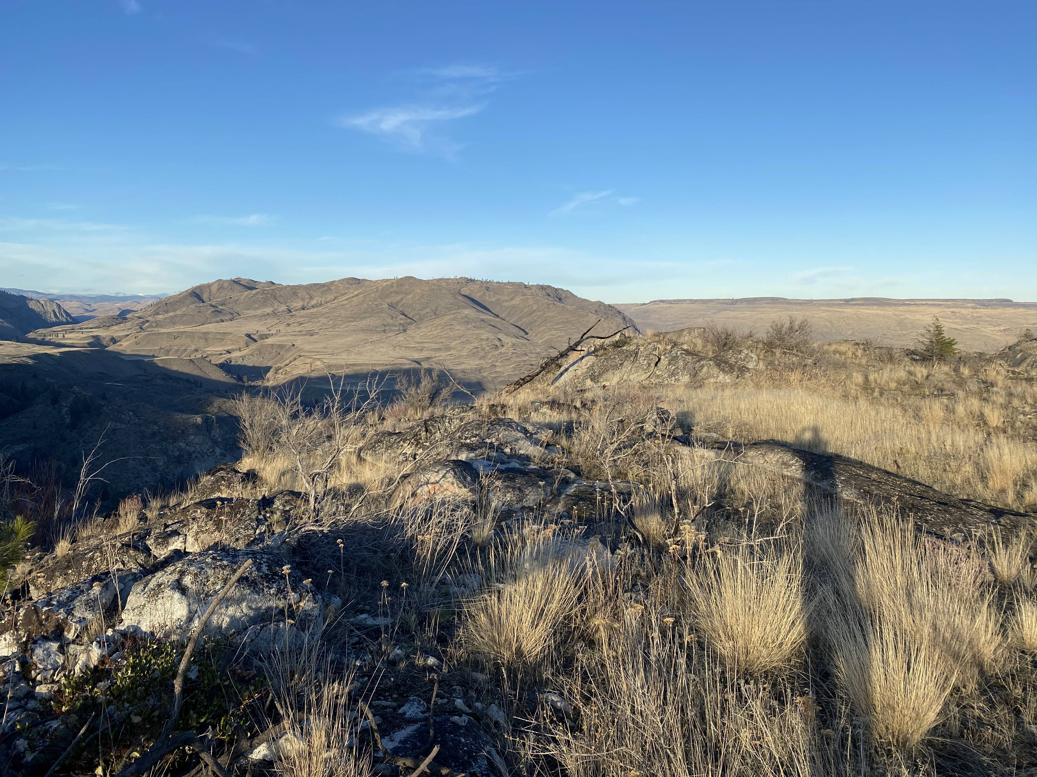 From the pullout, I hiked almost due east until I was able to start making progress up the ridgeline to the south. I could just barely make it around the steep terrain without straying off of public property. I saw a downed barbed wire fence at what I believe was the boundary with private property, but it's feasible to stay on the south side of it. Once I started uphill towards the peak, it was fairly easy to pick out a good route up that wasn't too steep.