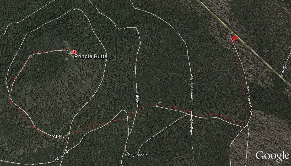Pringle would probably be a drive-up or near drive-up in the summer but I am not sure whether the roads would be suitable for a passenger car or not as they were covered with snow, thus making it a snowshoe for us. According to the map there are at least 3 access points. We took North Ponderosa Way as it was the first we came to and appeared to have the most direct route to the summit (it does looks a bit like a maze on a map).  On some maps (including Sota Goat) 4410 appears to go pretty much straight up from North Ponderosa. While it is the most direct route, it has been closed to vehicles. If you are hiking this is the way to go. It is less than a mile.