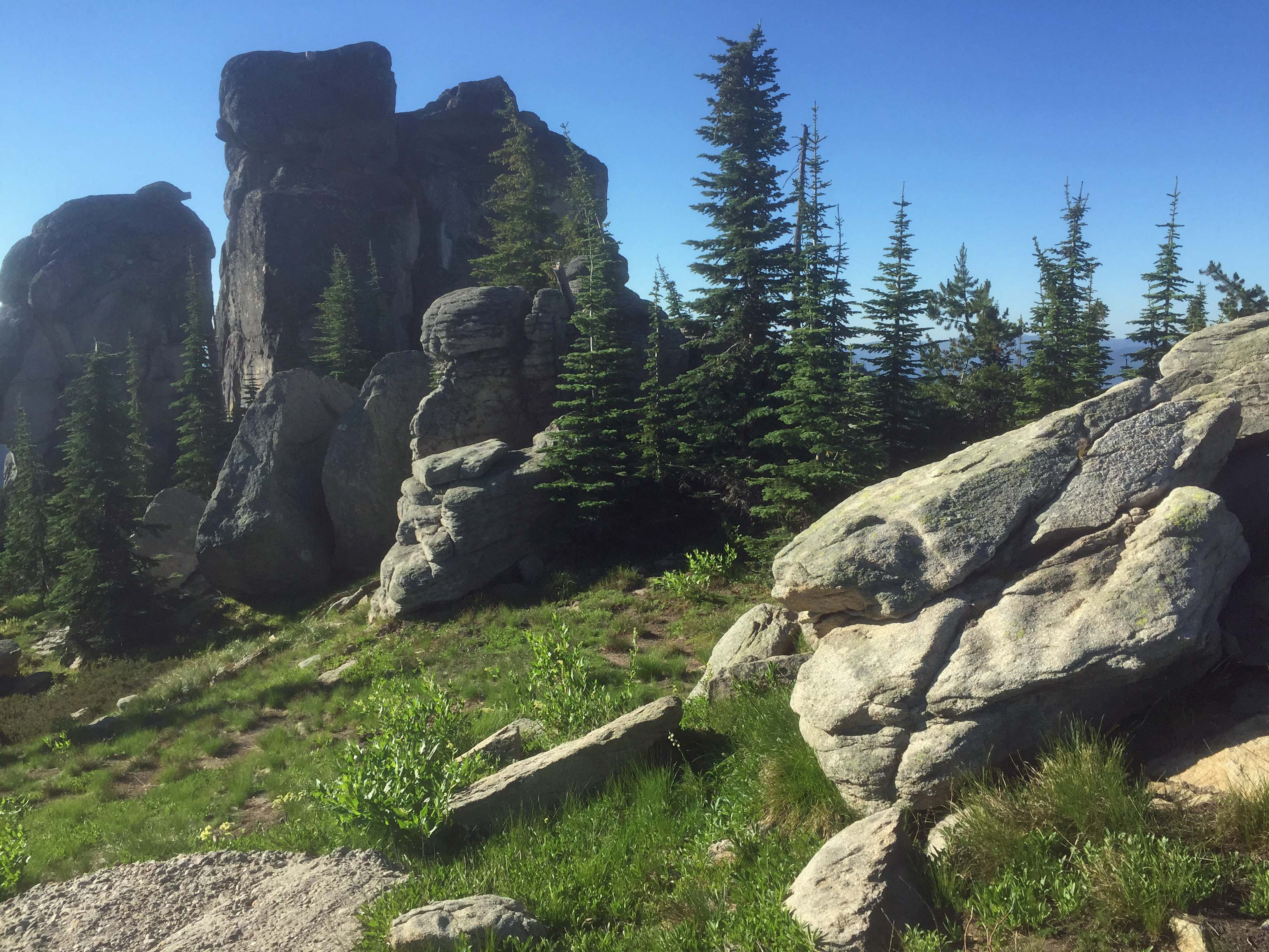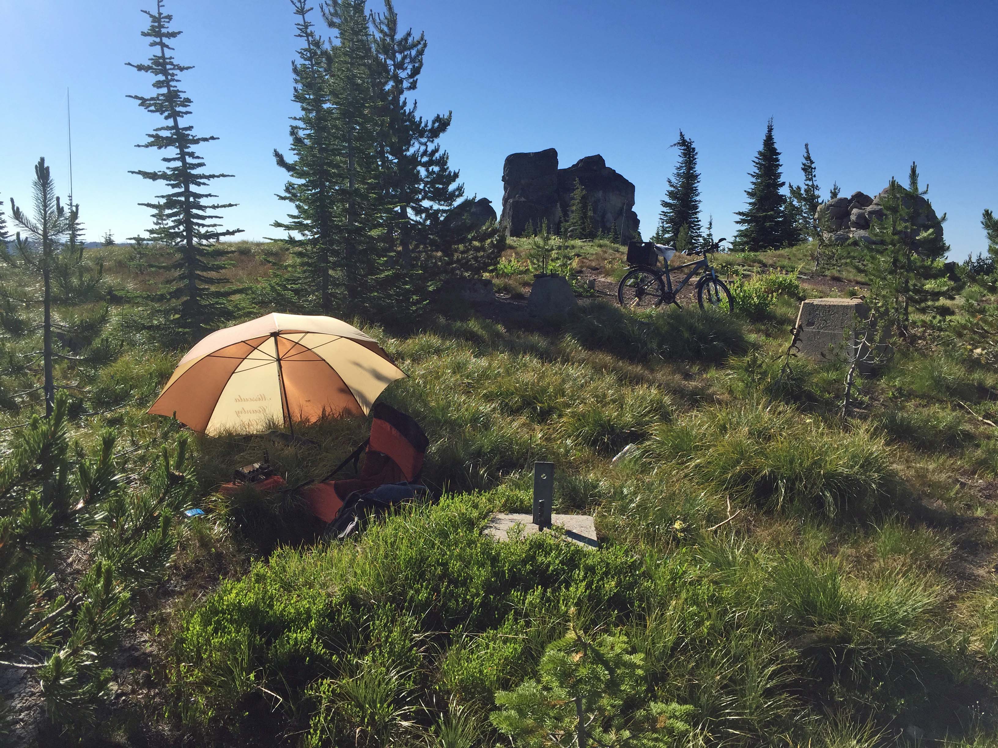 This summit is the old Horseshoe Lookout Site. It had a primitive platform on a rock pinnacle from 1921-1961. A standard L-4 structure, 1962-1983. Both structures succumbed to wildfires and were not rebuilt. Concrete blocks from the L-4 lookout remain. The access road, USFS #588 is 4 miles off FS #500. It is a good road and can be driven to the summit. I opted to use a bicycle the last 1.0 mile due to a steep and rocky appearing section. You have already traveled #500 so this road will be no problem. Trees are available to hang antennas. There are rock pinnacles on the picturesque summit one which sported the original lookout platform.