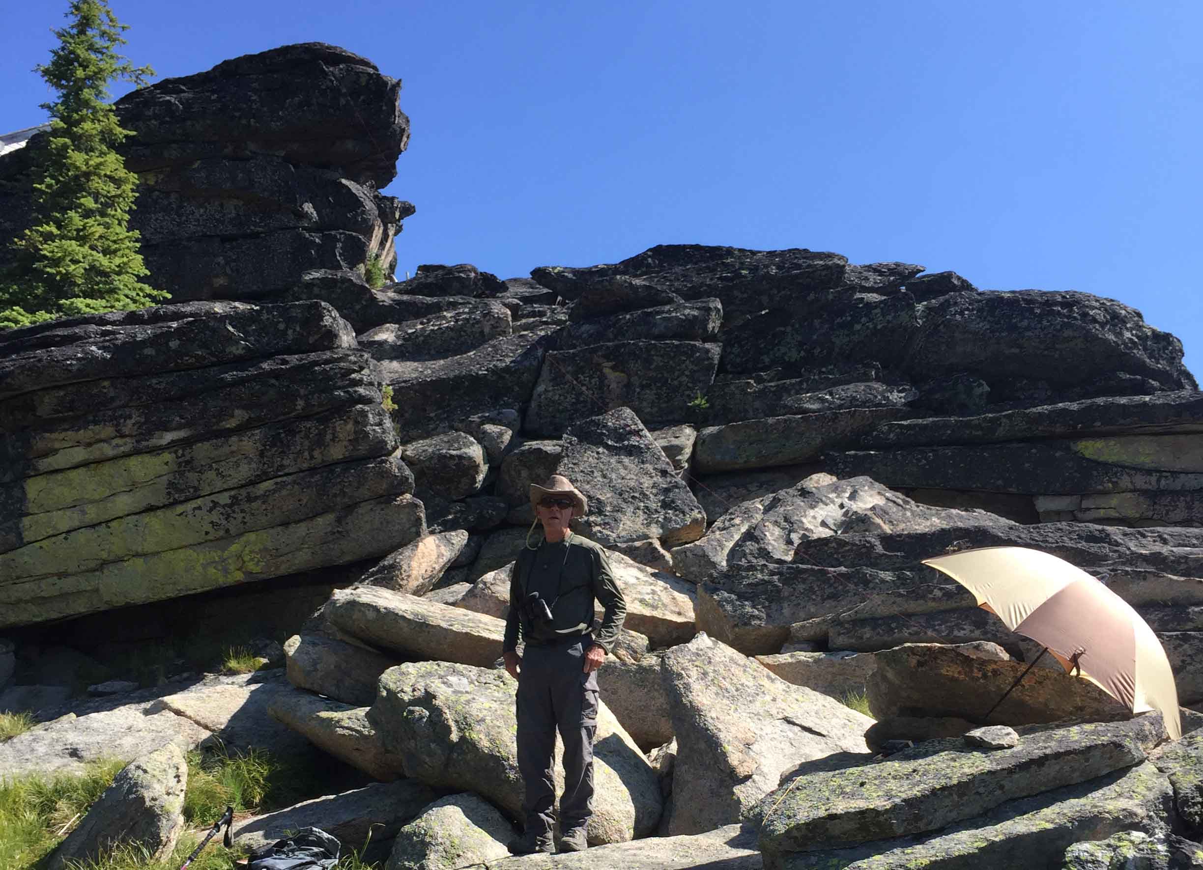 Skookum Butte is an old US Forest Service lookout at 7215’ on the Idaho/Montana border. The summit and lookout rests on massive granite boulders. Not having enough room at the lookout to secure our long wire antenna, K7PX Steve secured one end of the End Feed Long Wire to the top boulder, pitched the other end over the cliff and operated the antenna from below as a sloper. The lookout offers a fine view of the northeast end of the Selway Bitterroot Wilderness.