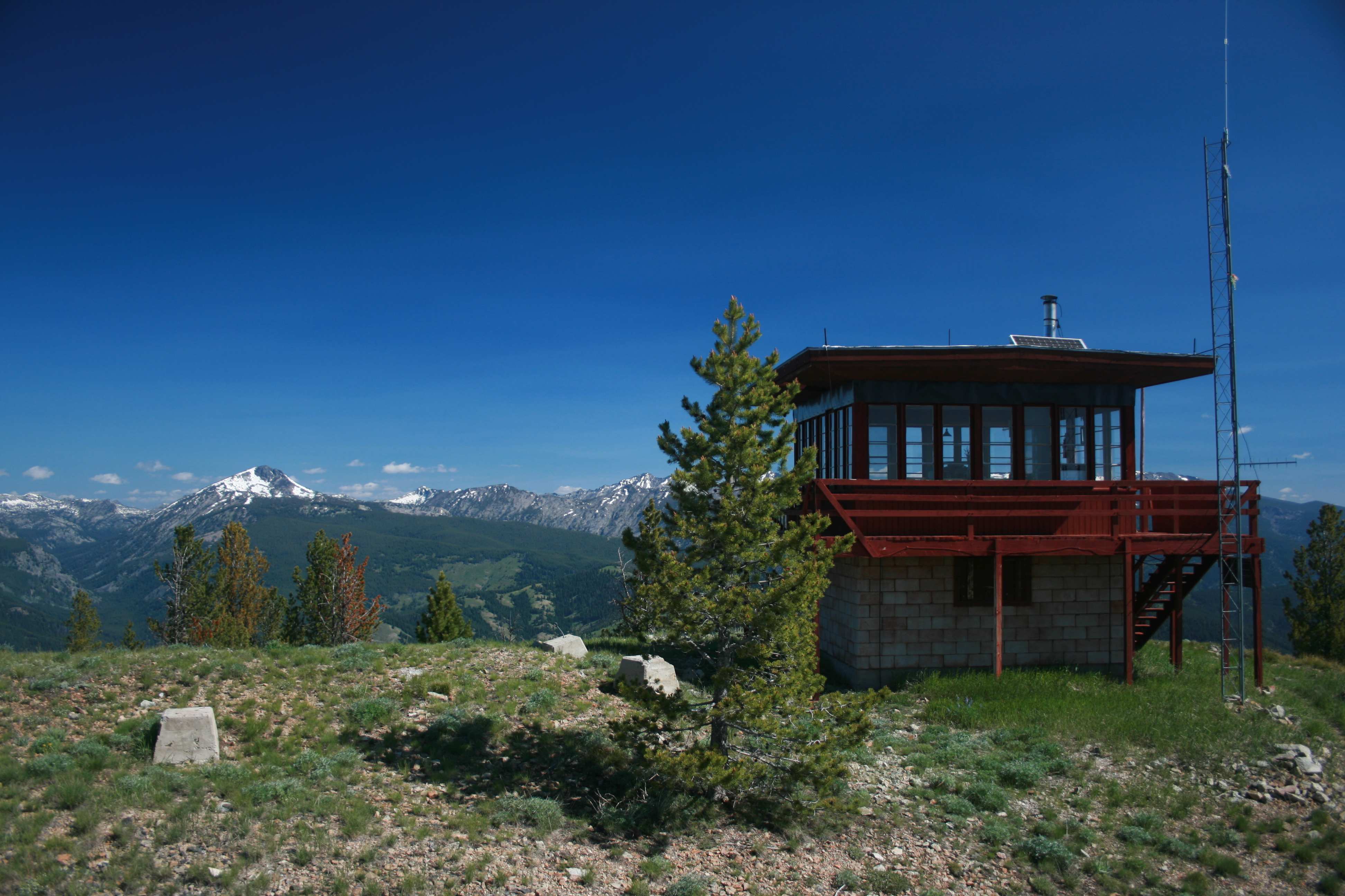 There is ample room away from the lookout structure to set up wire antennas using whitebark pine trees, snags or bring along a pole. Much of the south side of the summit is open grassland. The north side is tree covered. The summit is a rarer grid square, DN25.