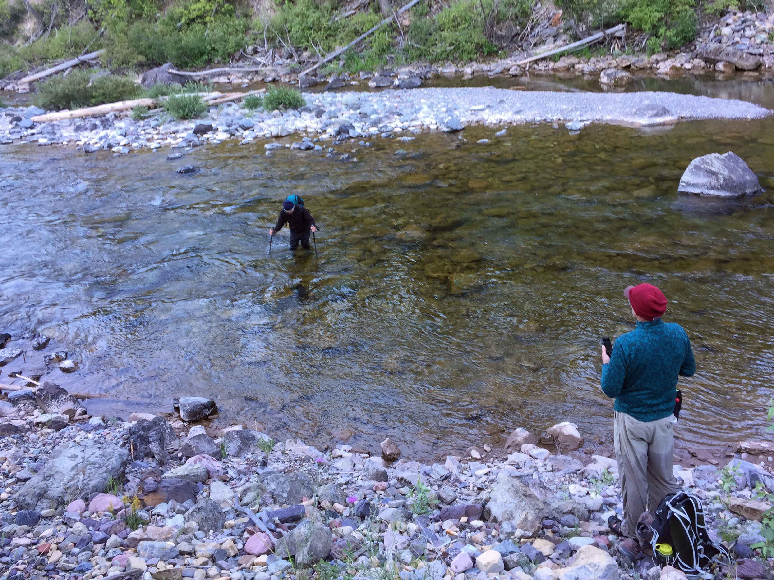 From the trailhead follow the Hobnail Tom trail for nearly 0.75 miles. Just beyond the junction of the Outfitter camp trail 200 feet up the main trail follow an unmarked trail to the right, east which drops down to the North Fork Blackfoot River at a low water ford. Cross the river. Caution, the river runs very clear and deceptive to depth. Hiking poles and sure footing are recommended.
