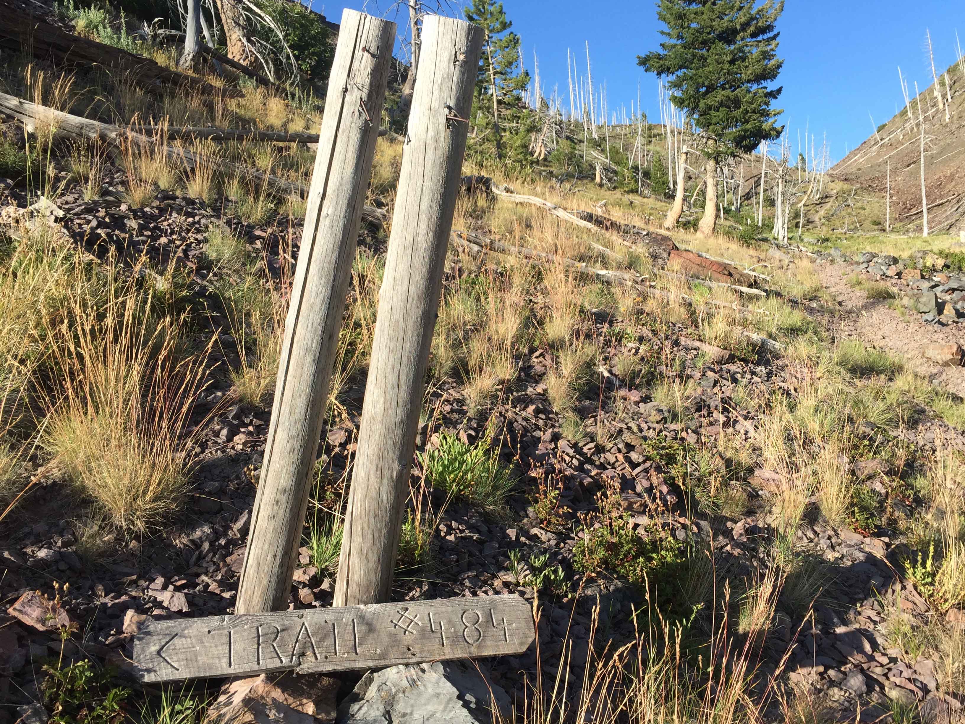 Less than 0.25 mile from Windy Pass a trail takes off to the north, climbing with a switch back and rises above Windy Pass. An old sign lying on the ground numbers this trail 484. This trail leaves the windy pass trail at about 6830’. This is a good trail to use to head around the east side of Mineral Hill. It’s an easy hiking trail with a few down logs and boggy areas where the trail is easily lost. The trail is visible as it crosses ridges. Continue on this trail for approximately 1.5 miles, just beyond a shallow lake. Here intersect the main east running ridge from the summit. Up this ridge is a good 0.25 mile scramble to the summit.