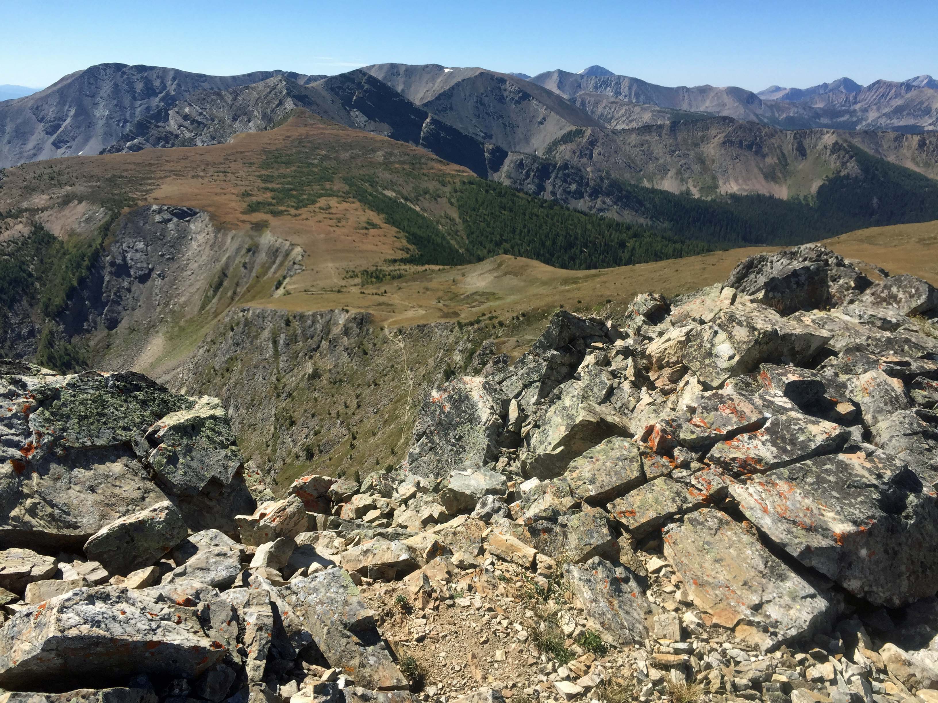 Directions: Leave Montana Highway #1 approximately 12 miles west of Anaconda, Montana turning south on the Storm Lake Road #675. The Storm Lake Road is good for approximately six miles. Then the road begins to deteriorate over the next ½ mile. Depending on your vehicle it’s a good time to find a parking place. For those brave drivers in a high clearance vehicle one can navigate large gullies, potholes and boulders to reach Storm Lake. From Storm Lake, travel 2.3 miles on trail FS#41to Storm Lake Pass. At the Pass some more technical scramblers head up to the summit along the southeast ridge or the face. I continued another ½ mile to Goat Flat. There one can pick up the open grassy southwest ridge and find it is a class 2 hike-up to the summit.