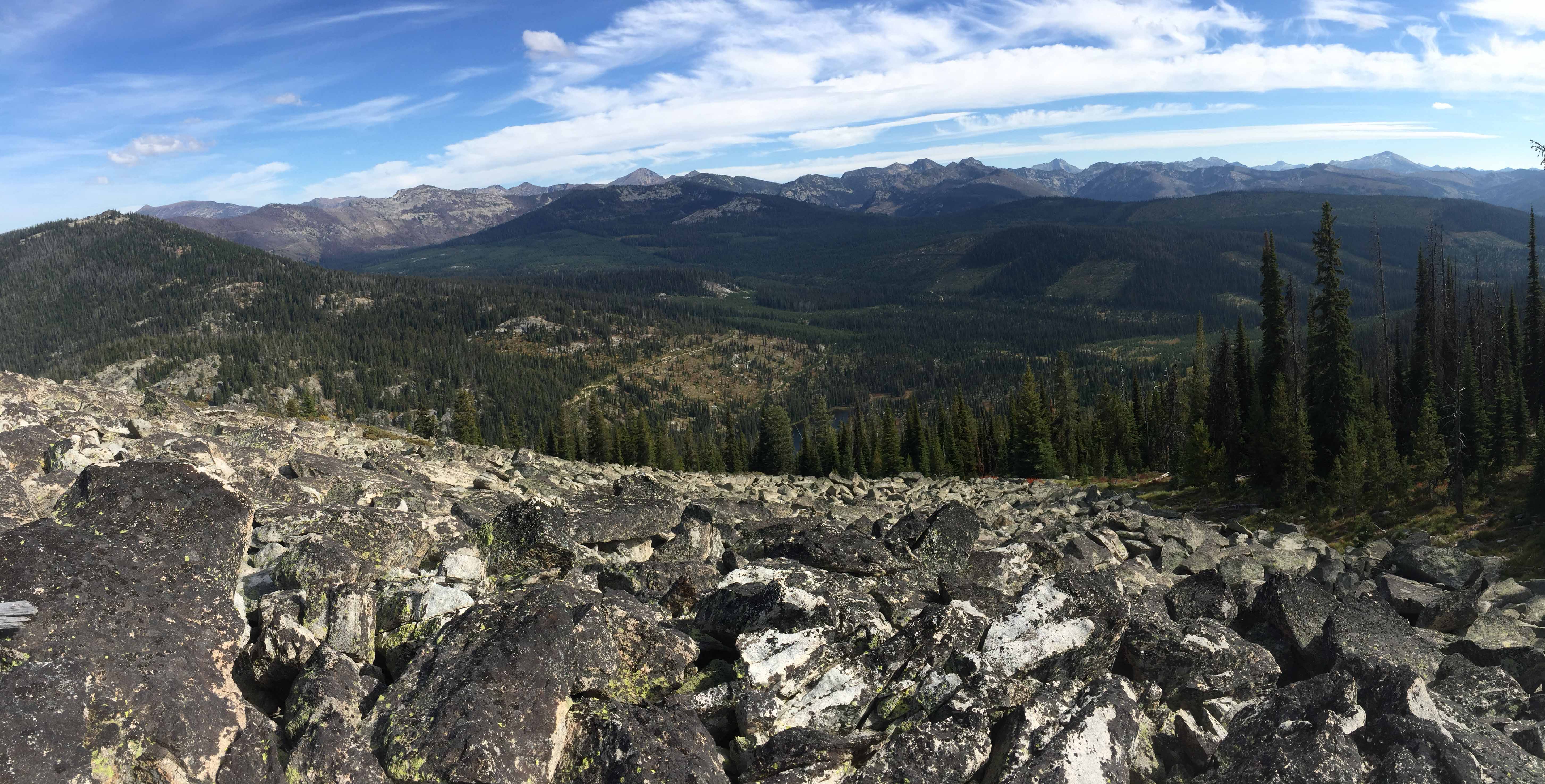 Directions: From Lolo Montana travel west on Highway #12 approximately 10 miles to the Elk Meadows Road #451. Turn south onto this road driving approximately 10 miles. The road becomes FS #373. Continue about 2.25 miles to FS#5959. This gate may be closed. Follow this road 1.75 miles to FS#5962. Turn right onto this road that drops and crosses Brushy Fork Creek. Follow this road approximately 1.25 miles to an old logging spur making a hard-right turn. Travel up this logging spur for 0.3 miles to intersect FS Trail #1. Hike this trail approximately 0.7 miles to logical openings near the south ridge of the summit. From here it’s about 0.5 miles to the summit. It is good travel, but has some tippy large talus boulders with a few hundred feet of the summit.
