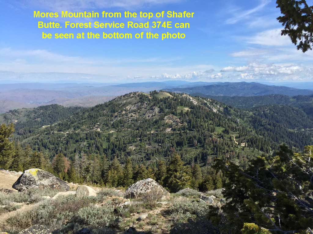 After a week of daily thunderstorms the weather forecast appeared to give us a one day respite on Monday, May 25th. So, off we headed to the mountains north of Boise and around the Bogus Basin ski area where these summits are located. The plan was to park at the Mores Mountain/Shafer Butte picnic area which is in a saddle between the two summits. We would then hike up to Shafer Butte, activate it, come back down the cars and resupply, then hike up to Mores Mountain. Finding the picnic area is quite easy. Just drive up to the Bogus Basin ski area, head past the cross country ski lodge on the dirt road (Forest Service road 297 on Google Maps), go 2.7 miles until a well marked road heads off to the right 1.3 miles up to the picnic area. (Forest Service road 374E on Google Maps.) Goggling around can also uncover plenty of information on the area. For example: http://www.fs.usda.gov/recarea/boise/recarea/?recid=5125