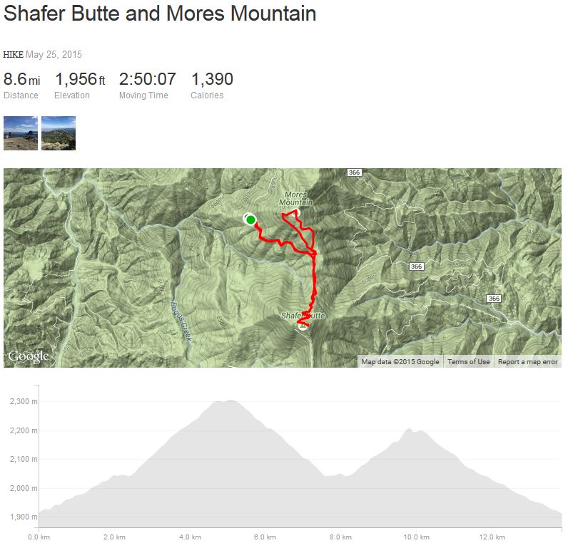 The hike back down to the picnic area was uneventful then it was off to Mores Mountain on a well marked nature trail. This is an easier hike taking us just 25 minutes to reach the summit in about a mile and 550 feet of vertical. Setup was easy and from this location cell phone connectivity was solid with no local RF issues like on top of Shafer Butte. Our operation was even briefer with K7MK making 5 QSOs on 20M SSB and handing the mic over to K7ZO for a quick few more followed by a short QSY to 40M for the west coast folks. Tear down took less than three minutes. We feel like we are a NASCAR or Grand Prix pit crew with a well timed coordinated effort getting everything into the backpack. Then it was a hike back around the nature trail loop and back down the Forest Service Road to the car. By now it was around noon and as we hiked down the road to the car we passed many families hiking up. They too were probably surprised by the gate still closed at the bottom of the road. But with a car full of energetic kids the last thing they were going to do was turn the car around and head back down the hill without burning off some of their energy. When we got back to the car our total hike was 8.6 miles with 1,956 feet of elevation gain for the day. Total moving time was a bit less than three hours. If we had been able to drive to the parking lot out numbers would have been 6 miles of hiking with 1,556 feet of elevation gain. Our GPX tracks have been uploaded to the SOTA mapping project.
