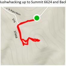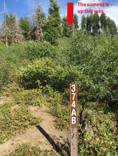 There is no trail to this summit so you get to pick your route through the brush. We hiked a hundred yards or so down 374AB and then headed on up. It was pretty much bushwhacking the whole way up except where we walked through areas that firewood cutters had cleared or where elk had created vague game trails. Finding your way to the summit is really easy. Just keep heading up hill and you will get there. Luckily the total climb is only a little over 200 feet and when you reach the summit there are a few rock outcroppings indicating you have arrived. By this time it was about 4:45PM and we knew the day was getting long.