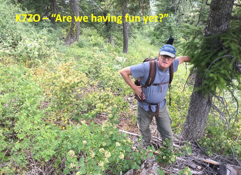 K7MK and I headed out late in the morning on July 24 to accomplish a double -- Boise Peak - W7I/BC-079 and this summit 6624 - W7I/BC-077. We were thwarted on our access to Boise Peak by an impassible section of road. See a separate activation report on Boise Peak for that story. This wasted well over an hour of time as we drove up the road to Boise Peak and then came back down again. If there was one silver lining is this cloud is that during the round trip we noticed that K7MK's APRS system was not working. We highly suspected that BC-077 would be without cell phone coverage so we needed APRS2SOTA for spotting. Some moderately quick jury rigging by K7ZO got his APRS system working and off we went to this peak.