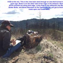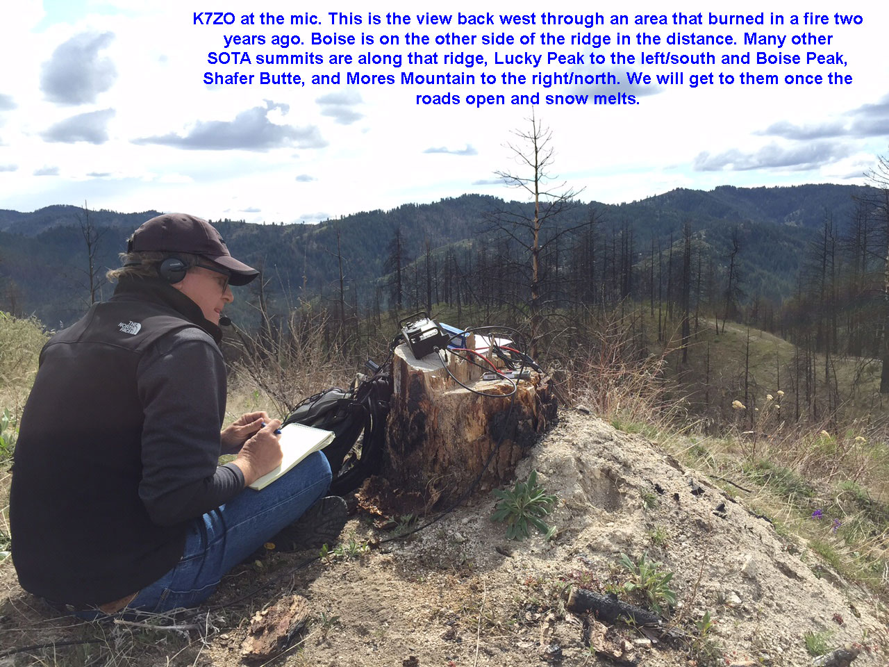 K7MK and I headed out on a somewhat blustery spring day for our second ever activation. With snow still on higher peaks and Forest Service roads not opening up until April 30th we headed to this nearby 1 pointer. Per Google Earth and other satellite imagery we knew there was a private home on the actual summit. But, it had been activated once before and the terrain looked like we should be able to find a spot in the activation zone somewhere to setup. Actually getting to this summit is a bit of a navigation challenge. After taking the Rush Creek Road exit off of Idaho 21 you immediately find yourself in a maze of dirt roads through the trees. There are tight switchbacks, intersections galore (each needing at least one "Where do we go" decision) and you are in the trees so you can't see where you are trying to get to. We were sort of following maps our phones but once ended up in a dead end that we thought was the direct road to the summit. After backtracking and taking a different route we finally made it.(See annotated map for our eventual route.)