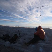 This was a fun activation of Mt. Hood. I decided to splurge on weight and bring the FT-817 and Buddipole (no coils) for 6m and 2m SSB. Once I got the antenna up, I found a number of chasers waiting on 50.125, so I'm glad I brought equipment for 6m. The mast was supported by shoving it into the hard snow on the summit.