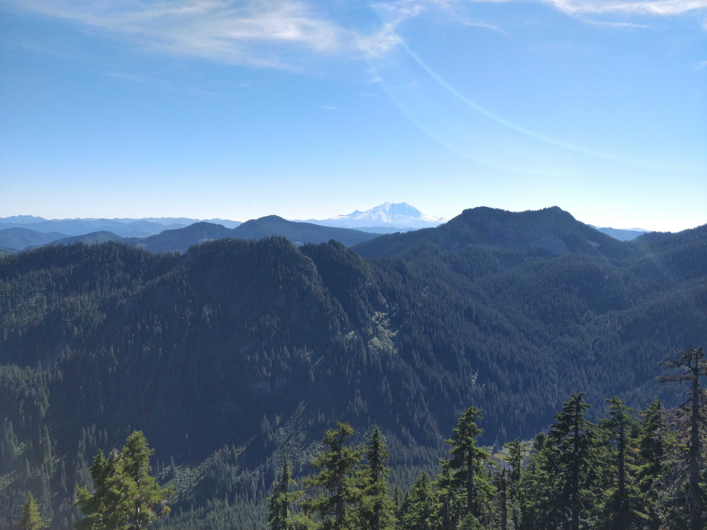 Summiting:  The last twenty feet or so to the summit is a scramble with plenty of good foot and hand holds. One of the few different paths to the summit has a helpful cable to assist in the climb. The summit area is a, east west ridge about 100 yards long and two to five yards wide. The north face is mostly scrubby little pines with a few scramble tracks up and down. The south is a not quite sheer rock face dropping about 100 feet. THE VIEWS ARE AMAZING!!!!  Especially of Mt Rainier!  5 of 5  *****