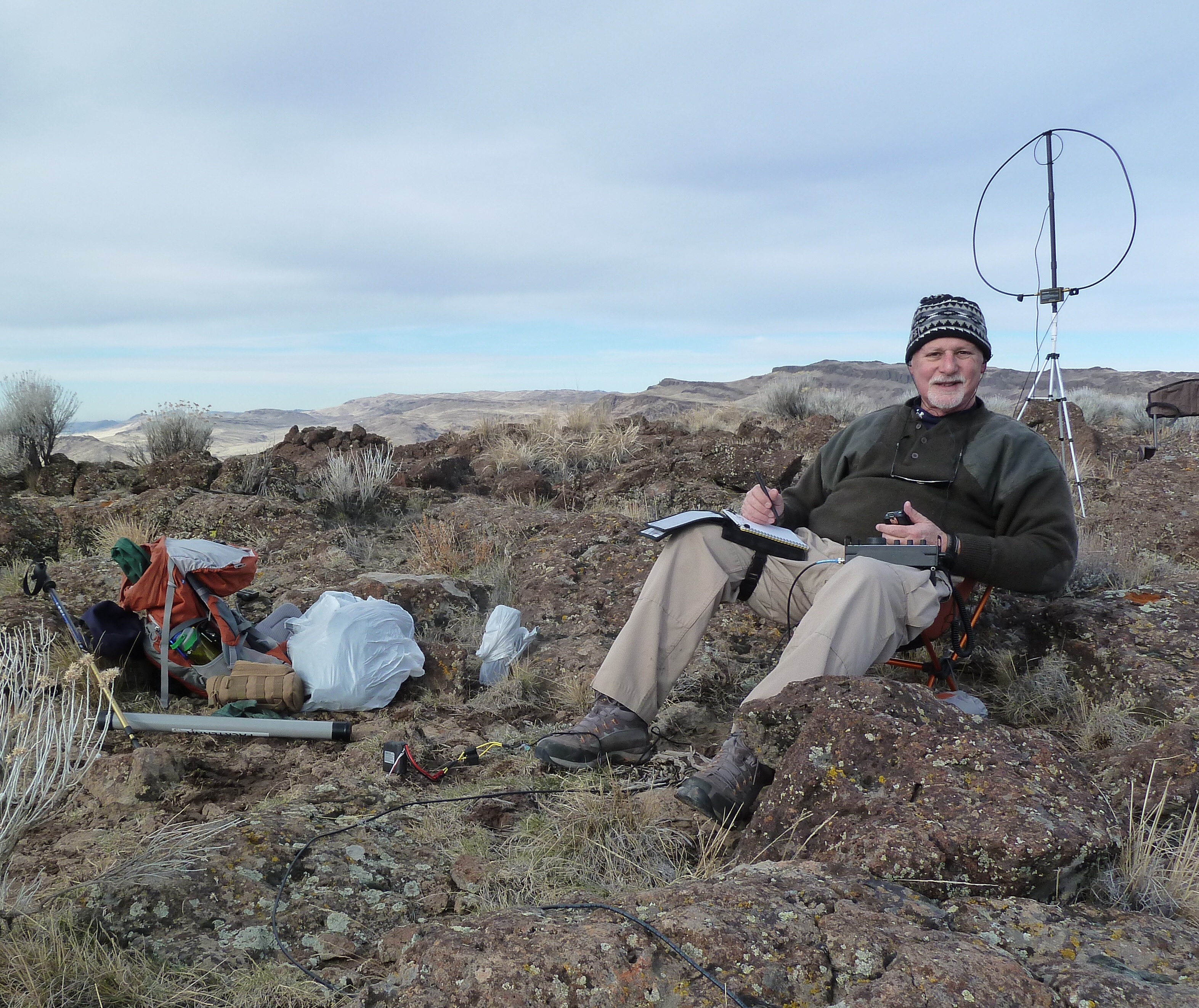 Once upon the summit we found a geocache, explored the views with binoculars, set up our antennas, and connected our KX3 radios. The summit is a flat top about 75 yards by 35 yards in size with rock/boulders and three small bushes capable to secure a mast. We had 10 to 15 mph wind with an increasing overcast cloud cover over the summit. I used a 10 meter / 32.8 foot mast with 35.5 foot wire and 9:1 unun sloping to the east. KC8WF used an Alex Loop antenna. I incorrectly used email from my DeLorme InReach (Iriduim) to self-spot, which failed to send. My second SOTA Chaser, W7RV placed activation spot for me. Thank you W7RV! After that a pile up began for me. KC8WF used his AT&T cellular phone with LTE signal with 3 bars to self spot on top of Teapot Dome. Sloper wire antenna from mast seemed to be receiving and transmitting better than the loop antenna. We both had successful SOTA communications throughout the United States with 10 watts. My brother (KB6CIO) / my SOTA elmer too, was monitoring our first Idaho SOTA communications from California. Unable to clearly contact us on HF, KB6CIO sent a text message to my DeLorme InReach with excitement and congratulations of hearing our chasers and our success.