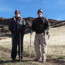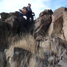 Getting there: From I-84 Freeway go north on Highway 20, 7.1 miles to Teapot Road (dirt road). East on Teapot Road 2.4 miles to spur road toward base of cliff. On the spur road, travel about .1 mile near the base of Teapot Dome toward a fence. Park in a cleared area that is free from tall grass to prevent rangeland fire. And park away from cattle trough, so cattle can get freely access their water. FYI, in photographs KC8WF is wearing a dark grey jacket with black pants and I am wearing a olive sweater or red wind breaker with tan pants.