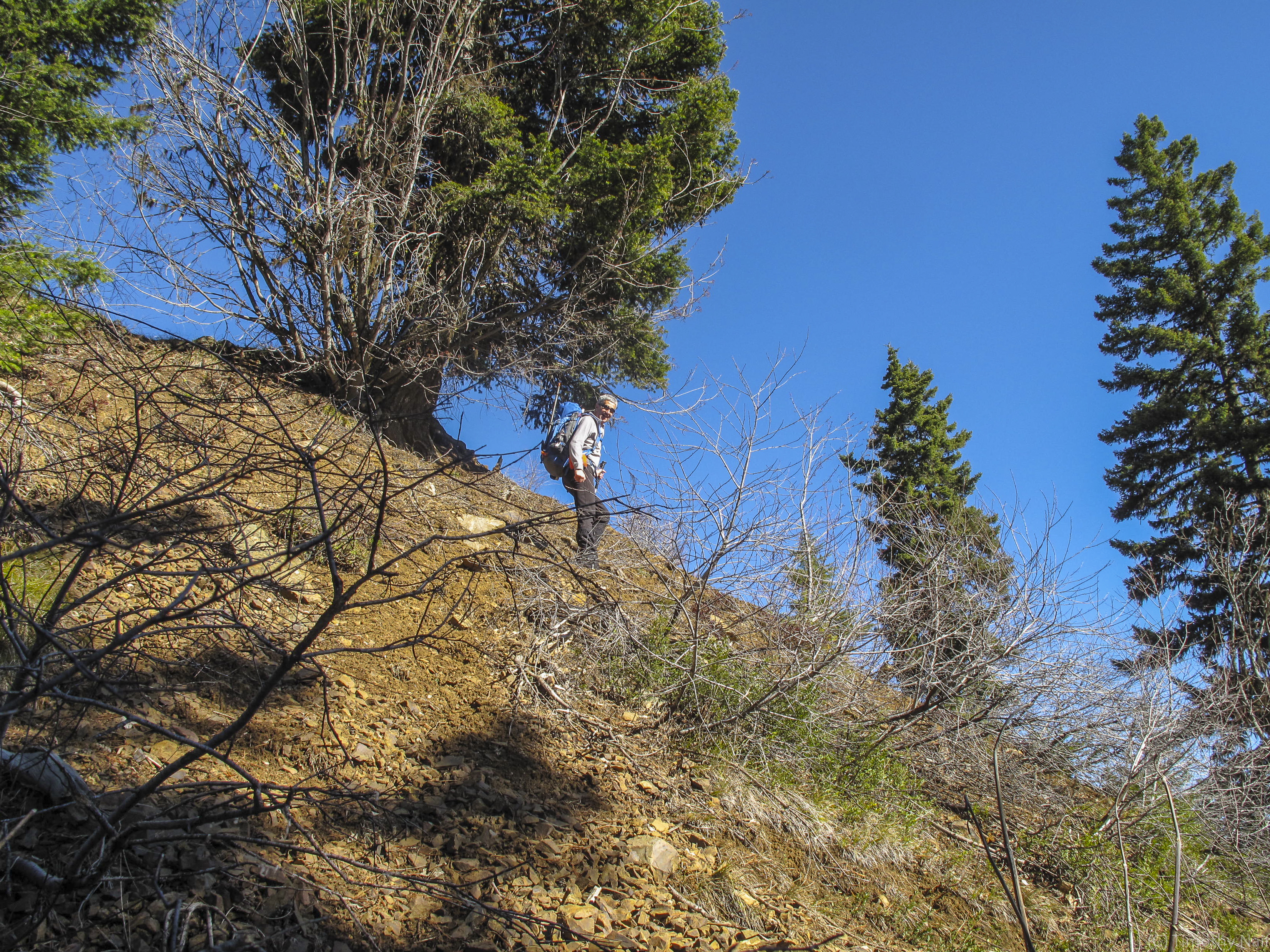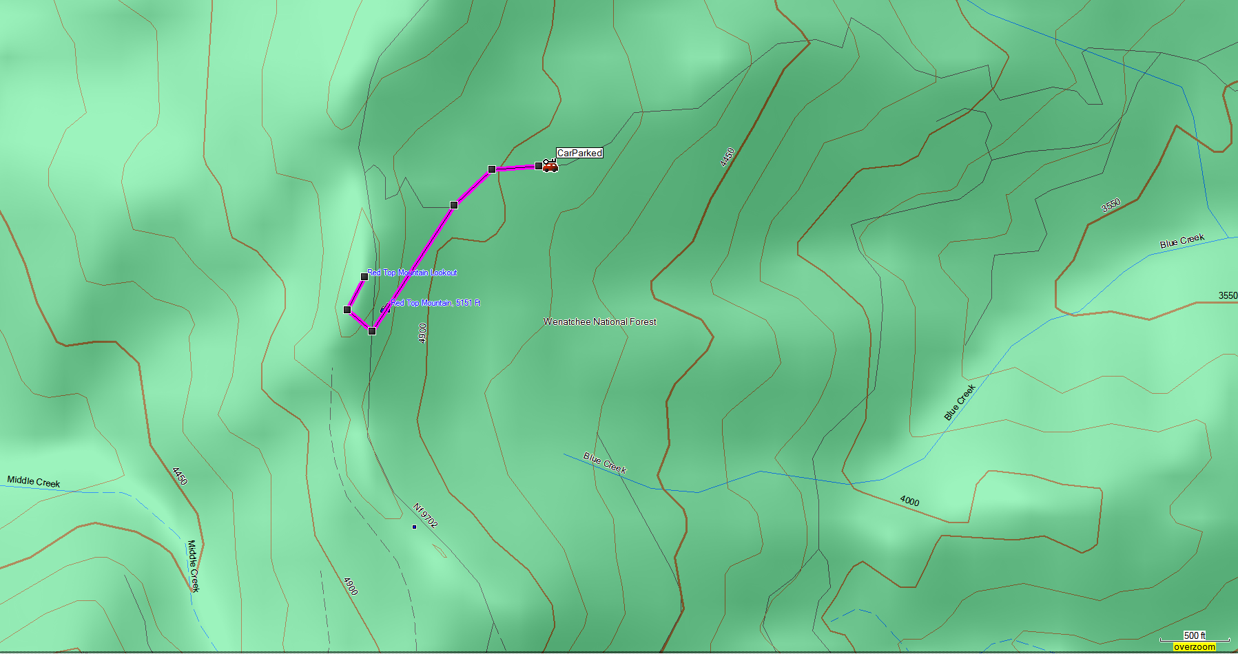 As Mark noted in his report, Mark did a great job driving us up the compact snow and ice covered Forest Service roads most of the way to the summer trailhead, parking at about 4300 feet - leaving us about 1000 feet of gain to reach the 5331 foot elevation of the summit where the lookout tower is located. I used the GPS app on my Android Smartphone, without data coverage, to mark a waypoint at the location we parked the vehicle. I use "AlpineQuest", a free app, and it works great on my LG Smartphone. Within less than 1 minute it had aquired 14 satelites and pin-pointed our exact location. Whenever traveling off-trail (as I knew we would be), I always mark at waypoint at the location of the vehicle, just in case we decide to take an alternate off-trail route back to the vehicle.