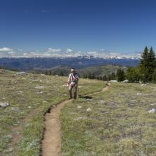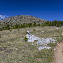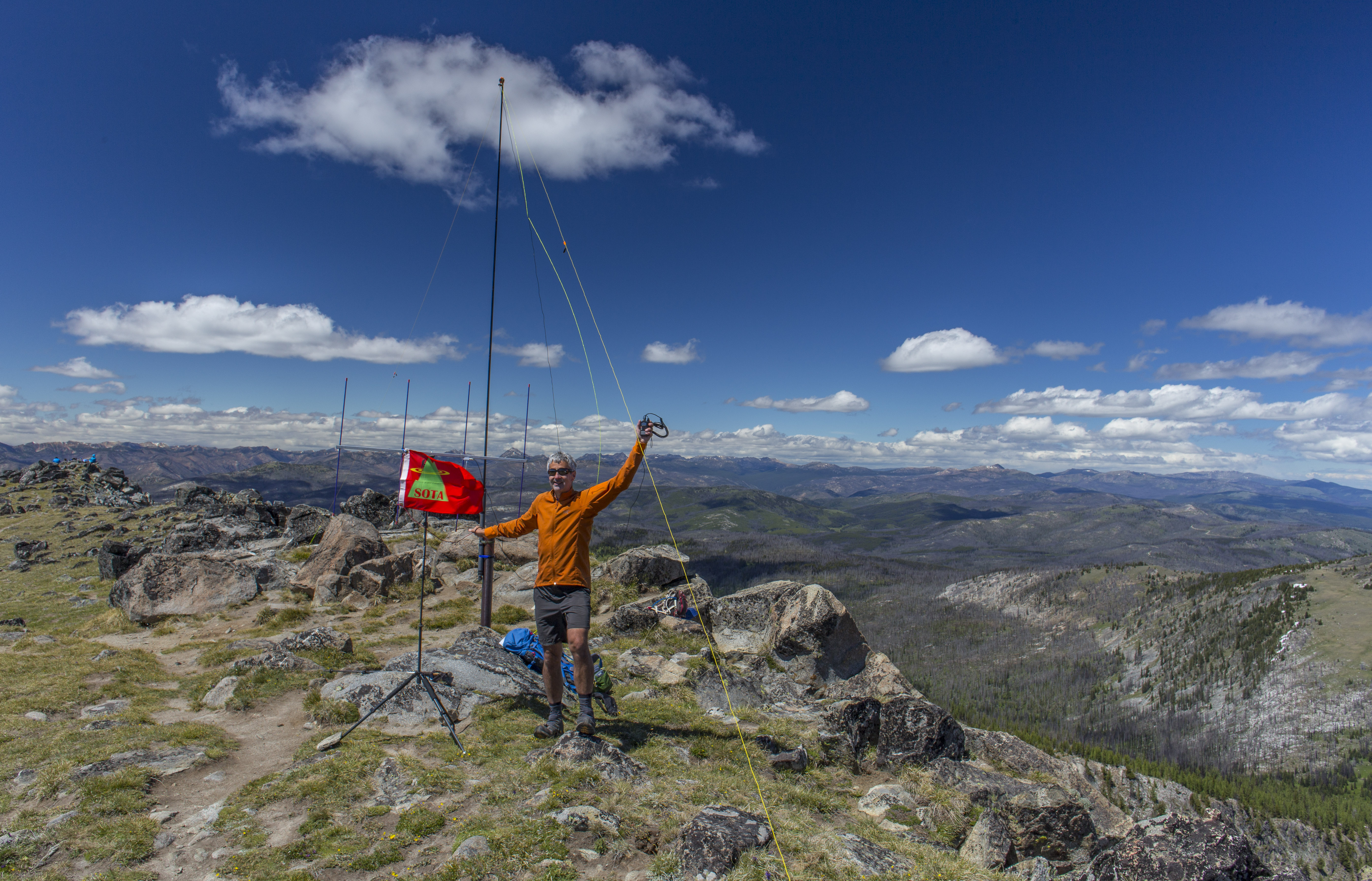 Tiffany Mountain’s 8242 foot summit classifies it as a 10 point SOTA summit. With only a few exceptions, 10 point summits in the W7W association are technical climbs, or exposed Class 3 or 4 scrambles.  Tiffany Mountain offers a well maintained and well graded trail to the summit. Starting with a gentle climb along a sparsely treed ridge, the trail gradually makes it way to a large grassy meadow about 1.5 miles into the hike. From the meadows, the wide rocky topped summit is viewed. The trail makes its way across the meadow to the base of the summit area, and then switchbacks several times to obtain the broad summit ridge. A few small trees decorate the summit block and ridge. Remains of a metal pole make the perfect anchor for attaching an antenna pole. The summit views are expansive 360 degree views.