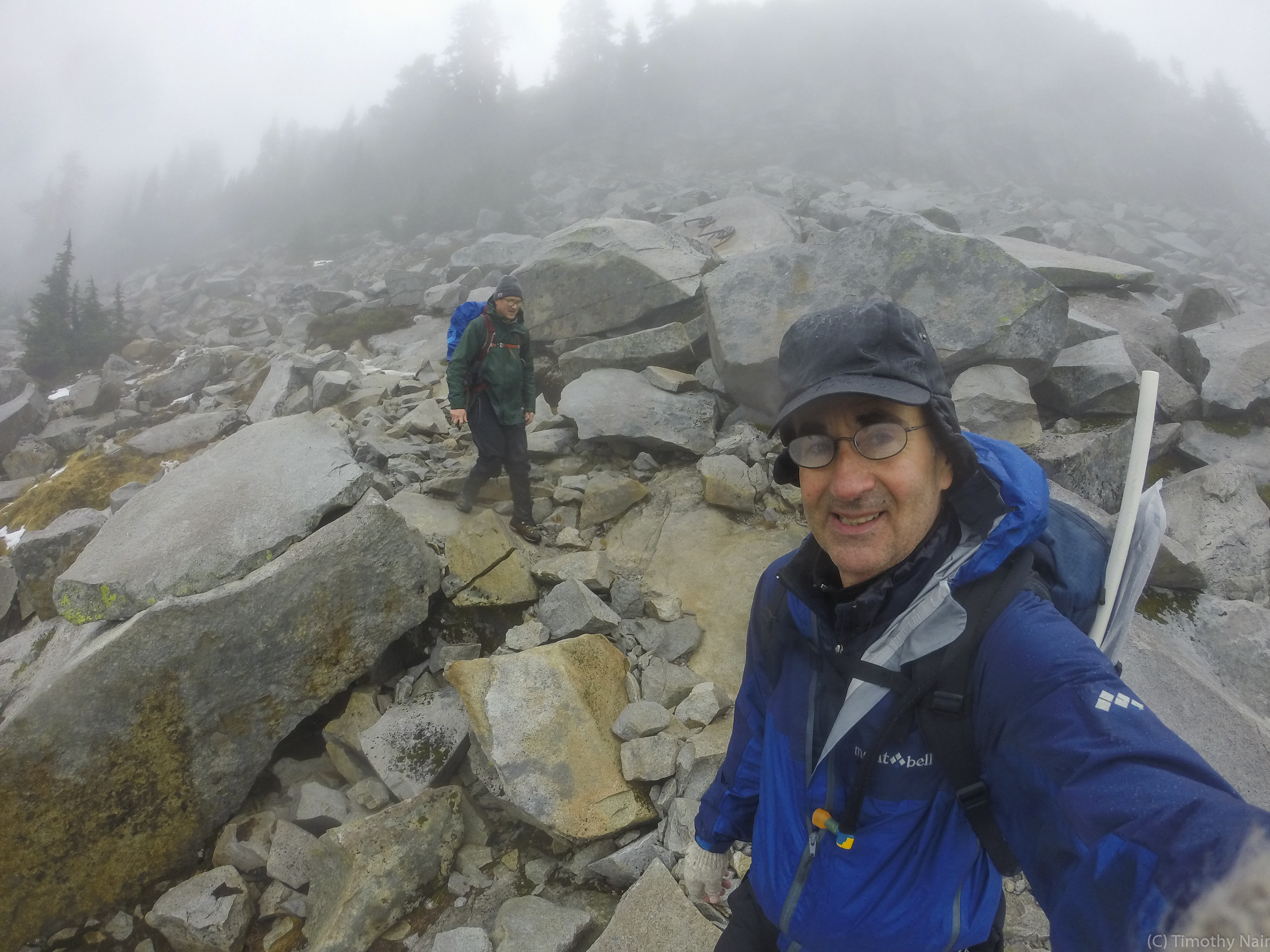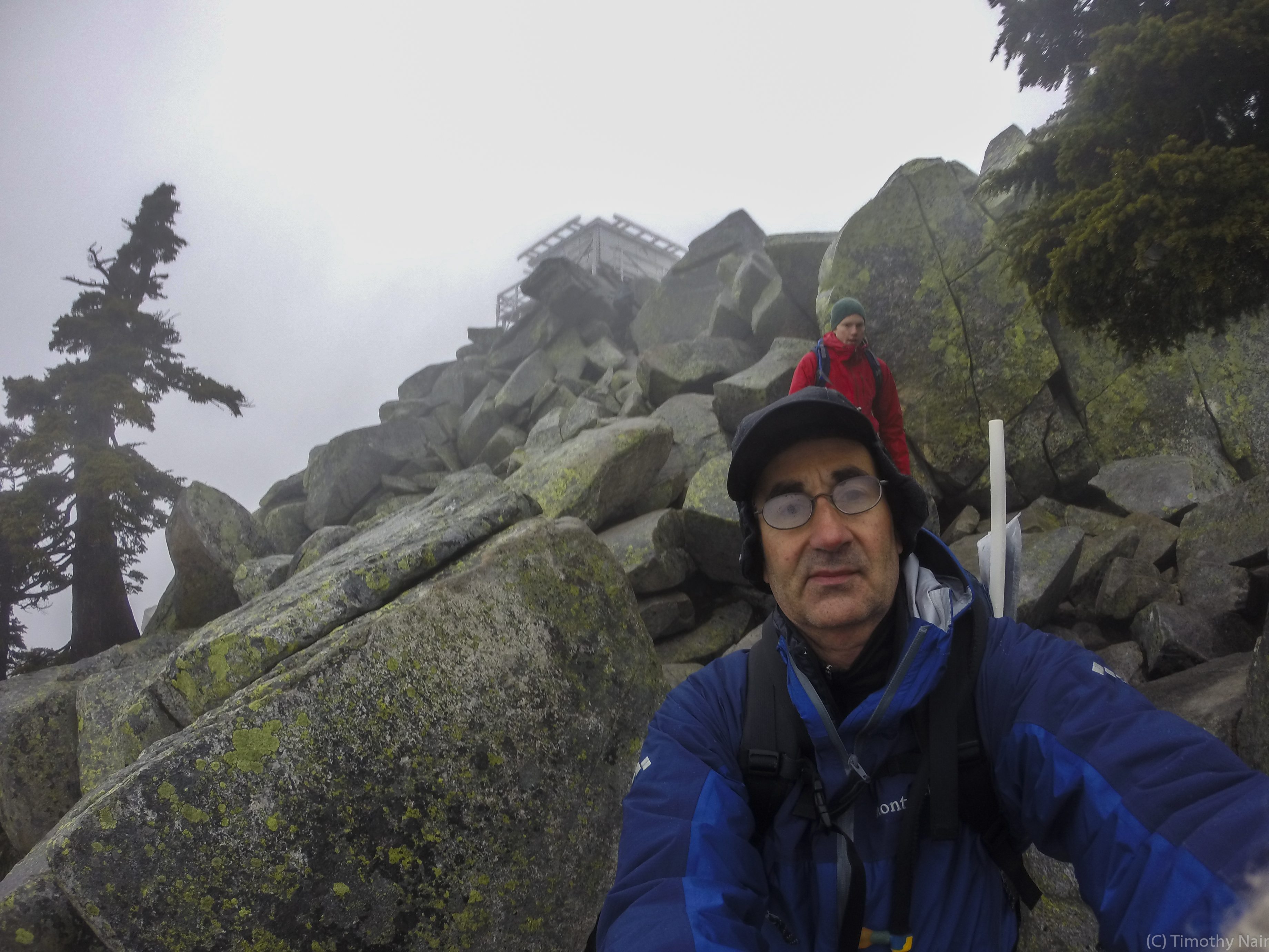 Arrived at the trailhead at about 9:30AM, and only 3 other vehicles - on a sunny summer day, there are usually 100+ vehicles! It was a very wet and windy day, right from the trailhead. About 1.5 miles up the trail, my wife decided it wasn't that much fun hiking in the high winds and rain, for no views at the summit. I pressed on while she returned to our vehicle at the trailhead. I made good time to the summit and the lookout. While there were some icy patches, I was able to navigate around them and as such never bothered to put on my "micro-spikes".