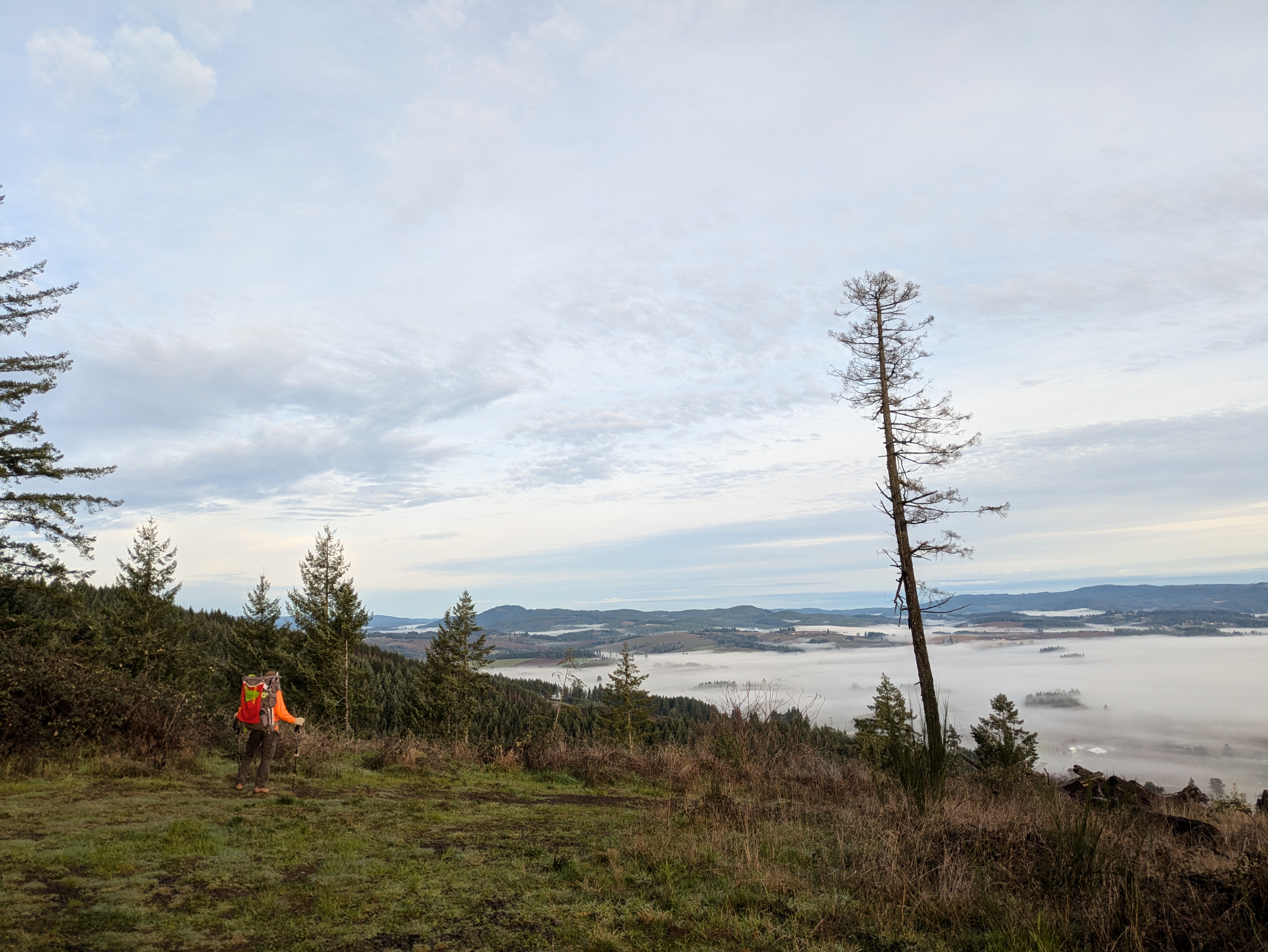 We left Bill’s (WJ7WJ) house at 8 a.m. The trailhead is not marked. It’s on a bend in the road and starts with a steep hill. I borrowed trekking poles from Bill, which has inspired me to get a pair of my own. Some parts are steep, and it’s great to have upper-body assistance as you climb David Hill.