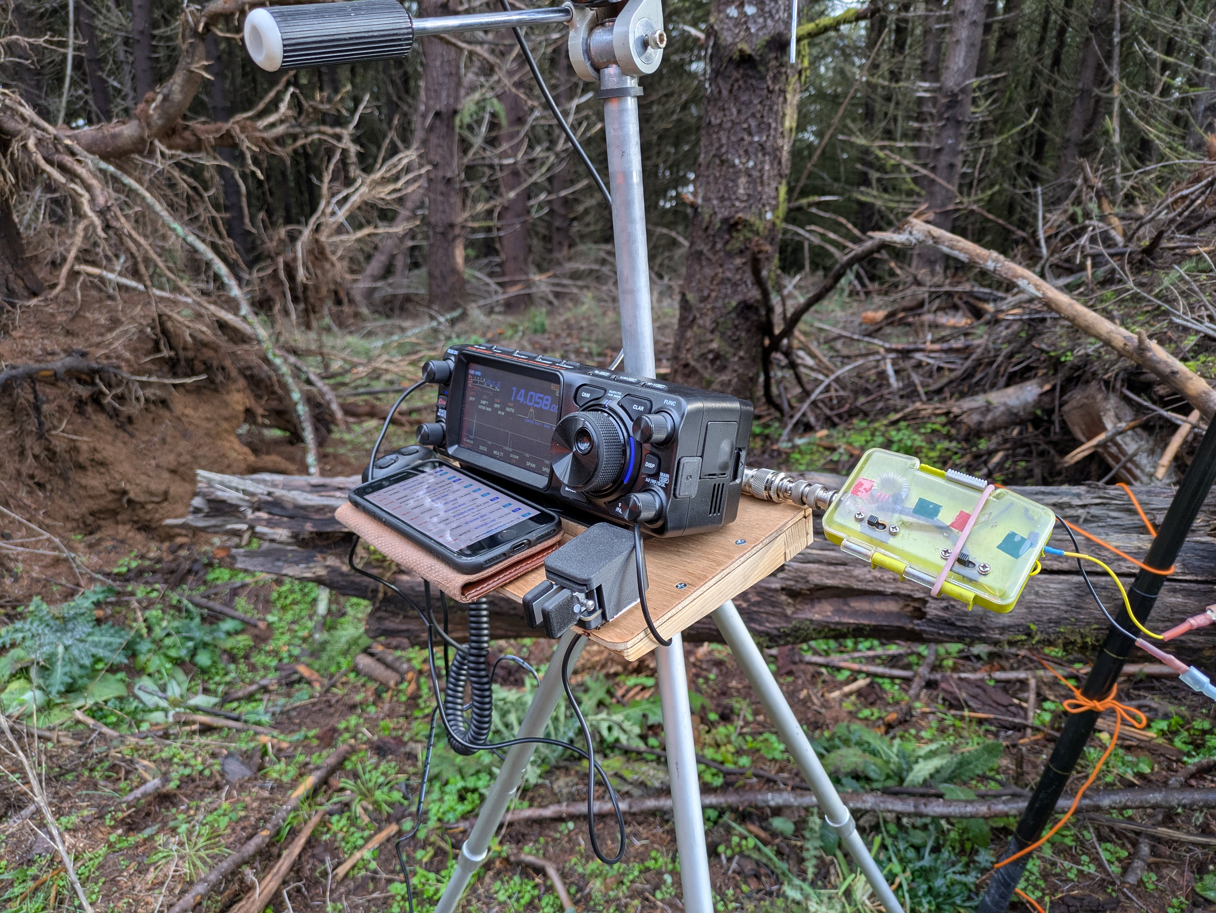 I used an end-fed half-wave antenna with my TX-500 Discovery. I had a place to mount my mast and reached Oklahoma that day with a 5-9 report at 10 W. Bill’s setup was unique. I didn’t realize it at first, but one of his trekking poles is a Yagi antenna! He also built a table for his tripod stand so he could operate while standing.