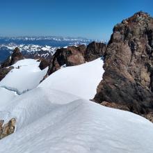 On day four, we got up at our usual time, 5 am, for the summit climb. This day felt easy with light packs and firmer snow. The 4th of July route, the one that goes straight up to the summit from Snow Dome, is out. According to the rangers, it hasn't really been an option for several years due to the bergshrund opening. We took the common Crystal Pass route. This route took us to the left of the false summit and then over the false summit from the east side. We were passed by a group of four as we approached the top of the false summit. The downclimb from the false summit to the saddle on the other side required a short wait as one section has loose rock, so we didn't want to kick rocks down on the other group. We could see another group of 2 rappelling off the true summit as we made our way down that section.