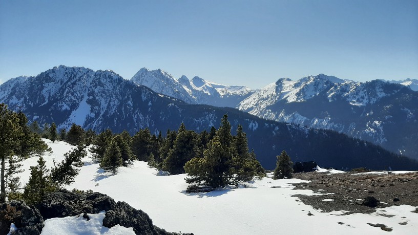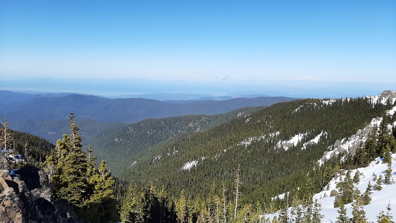 March 21, I left the trailhead (Upper Dungeness, across from Tubal Cain trailhead) at 1230. My Prius had chains on for part of the drive, just barely enought clearance with the snow. The trail had snow starting at 4500 feet. Microspikes were sufficient. Real snow started at 5000 feet, and I wished I had my backcountry skis. I was postholing up to my knees consistently, but deeper sometimes on the east aspect in the shade where the snow was more powdery. But it wouldn't have been a good ski tour, as I would have had to take the skis off many, many times due to wind-swept bare areas. Once at 5800 feet and up to the the summit it was largely windswept and bare of snow. So easy walking at that point. With slightly more consolidated snow real crampons would be good in a few spots.