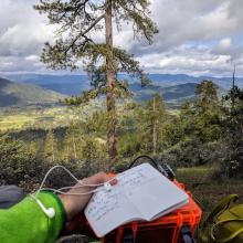It was probably because I was so struck with the mountains that I didn’t get too upset when I realized I’d forgotten the coax cable which I needed to connect my 9:1 matchbox to the radio. I cut the wire off the matchbox with a rock and connected it to the radio directly. Even without a counterpoise the KX2 tuned 40m to usable SWR. Neither 20m nor 30m would tune, but I only had time for one band anyway, so it worked out.