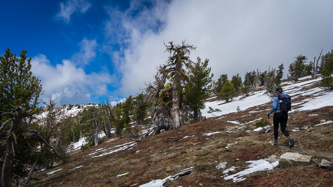 This is a highly recommended six pointer. It is a beautiful hike through meadows and up lighly forested granite slopes. The trail is well traveled, and even when snow covered the trail, we could head the general correct direction and soon see a cairn pointing the way. Be careful to not accidentally head up the trail to Twin Lakes, as we did for a few yards. I'm sure the lakes are wonderful, but the summit was our objective.