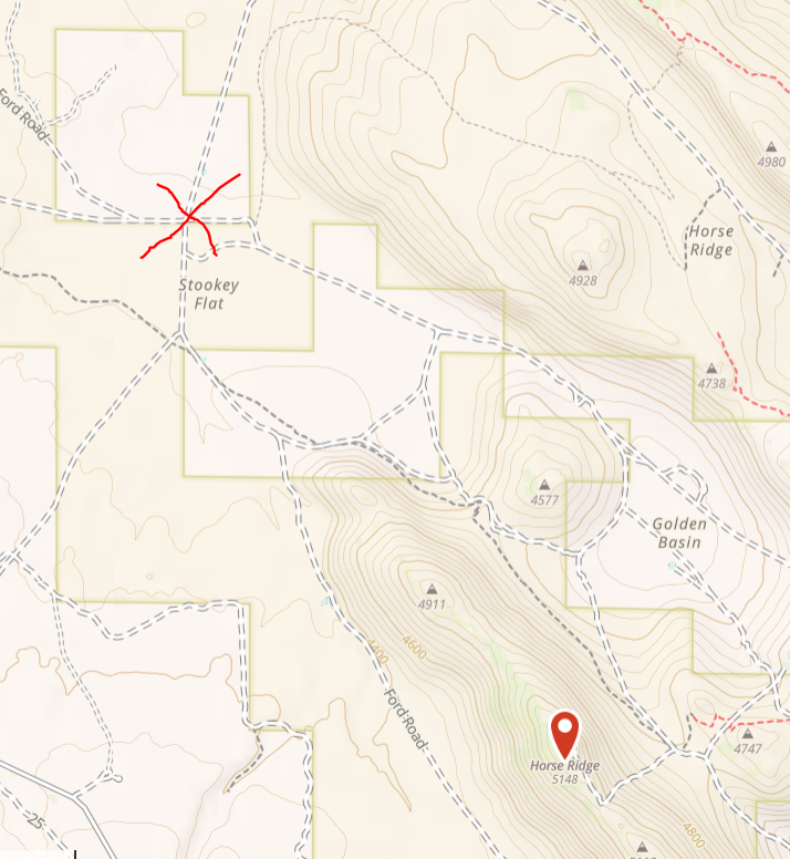 An outing to Pine Mountain offers an opportunity to activate 3 summits: W7O/CE-058, W7O/CE-068, and W7O/CE-176. After Pine Benchmark, I drove back to HWY 20 and headed west. I turned left on Spencer Wells Rd to head towards the OHV area. This summit was a bit of a weird one. There is a road all the way to the top. My efforts to get TO that road were thwarted by private property and no tresspassing signs. Perhaps it is possible to reach that road and take it up, but I was unsuccessful today. See map below for no access road.