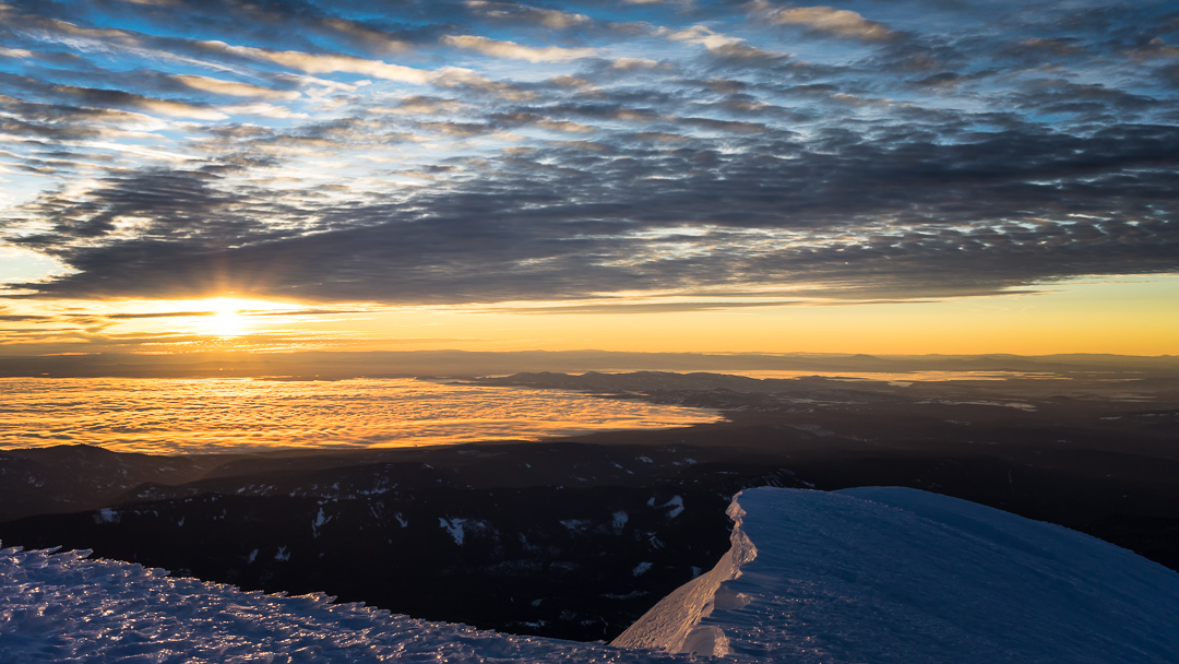 My friends and I left the climbers lot at Timberline just before 2am. We took our time and made the top of Palmer around 3:40am. After a quick breakfast we continued up the mountain on good solid snow. We were hit with sulfur from Devils Kitchen throughout the hike up.