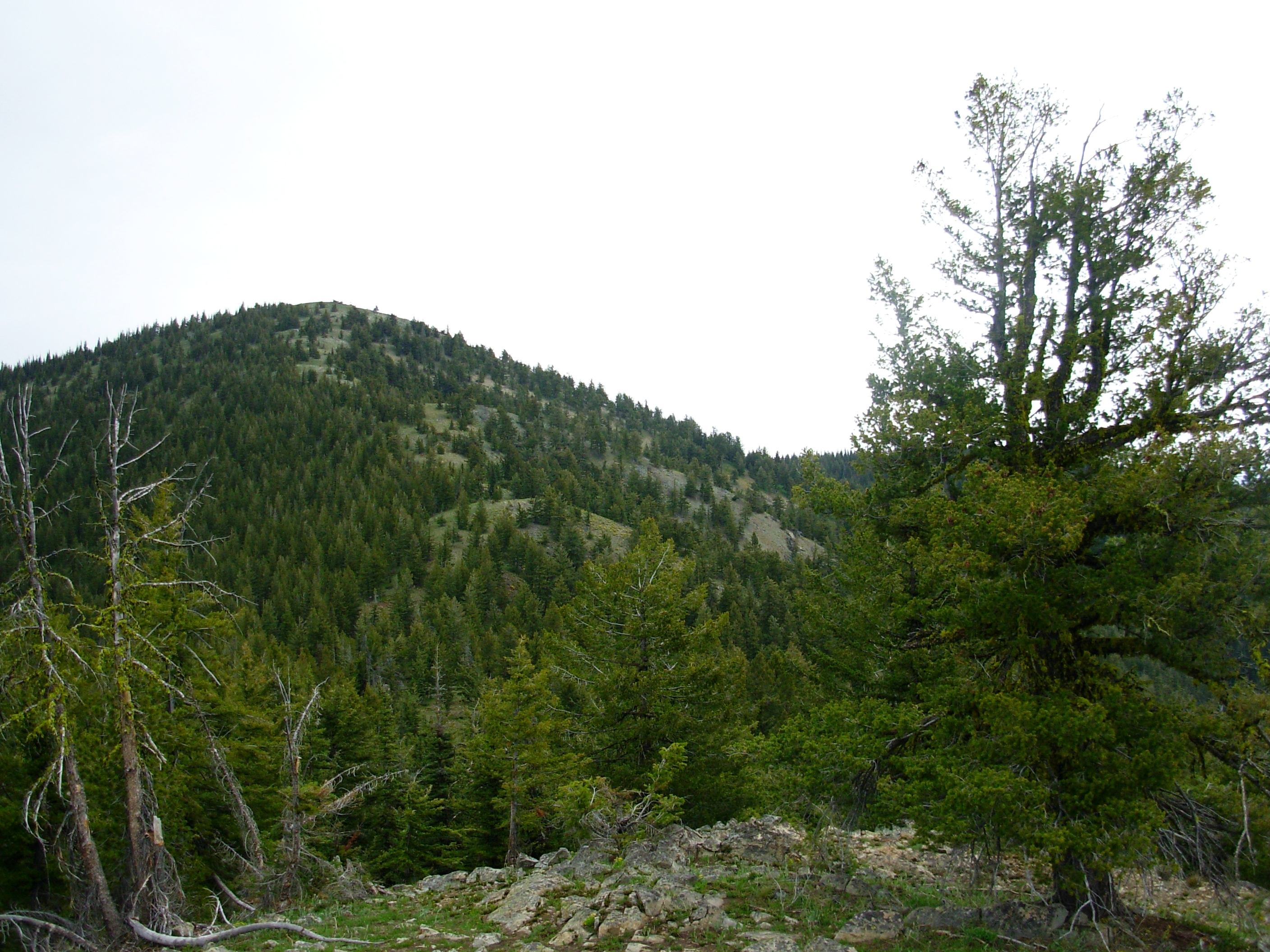 The summit is large, with plenty of room for a dipole. The cairn was a perfect support for my telescoping pole. The day was cloudy with sunbreaks. If it had been colder, it would have been simple to move down the gentle slope to get out of the wind. It didn't rain, but a very light snow reminded me that this peak is over 6500 feet. I was warm from the climb, and the temperature was about 50F so I just sat next to the rocks and enjoyed the view.