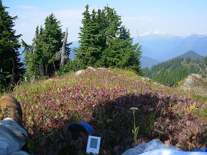 Jove Peak s an exceptional viewpoint with very few trees to obstruct. The top is long and fairly level in one direction. There is a lot of low vegetation grows in the shallow topsoil. The huckleberry bushes upholster one whole slope of the mountain with their wiry branches and deep red leaves this time of year. They probably accounted for the one visitor I saw all day – a lone bear who was about 500 yards downhill from me as I reached the top.