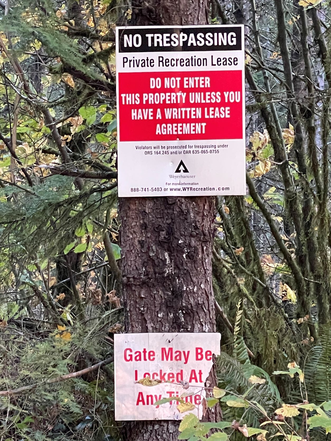 The four routes to Lookout Point are a combination of either crossing private individual, timber company, City of Portland, BLM or USFS properties. The two timber companies are Frank Timber Resources, Inc. and Weyerhaeuser. The main access route is via a Weyerhaeuser locked gate with a no trespassing sign. I’ve noticed cellular and SD Card only trail cams owned by Weyerhaeuser and the lease holds on the access road.
