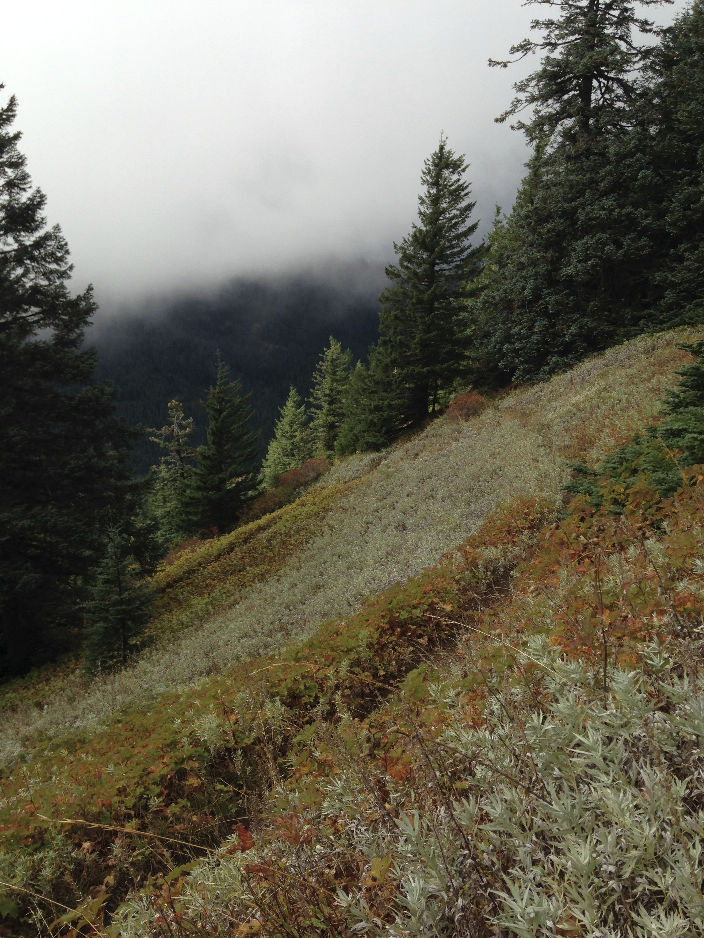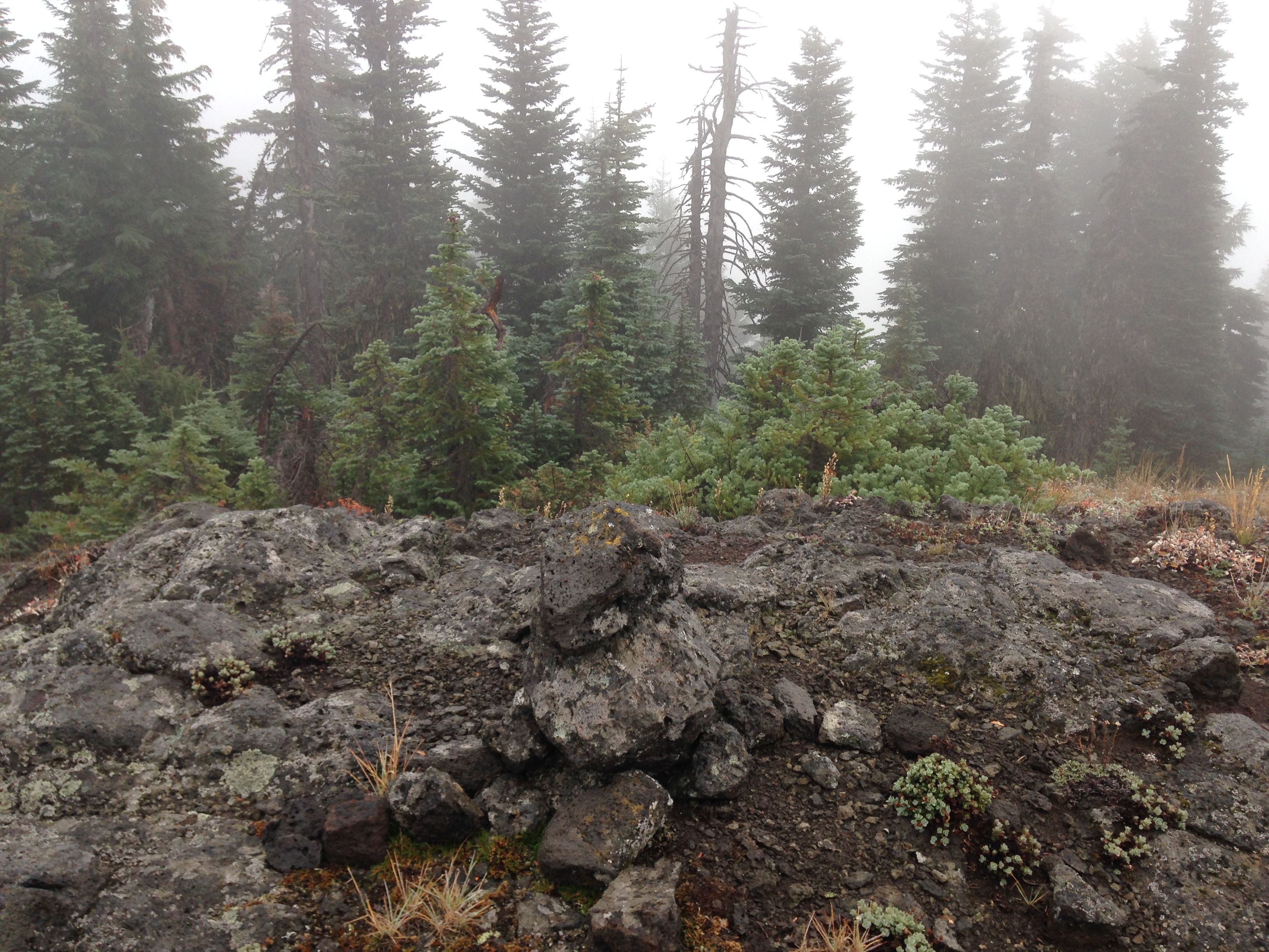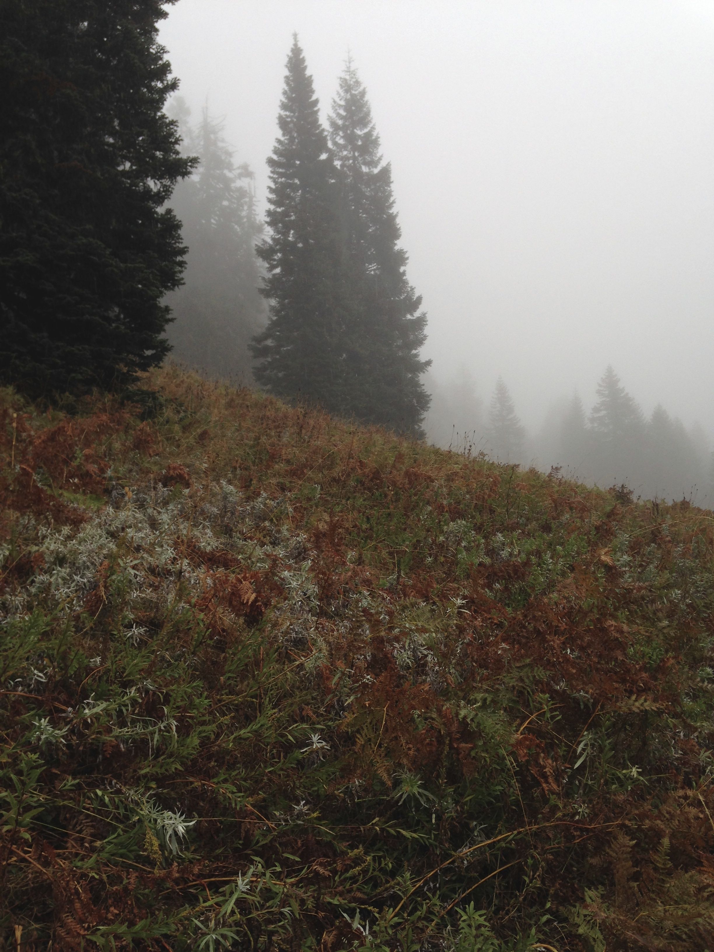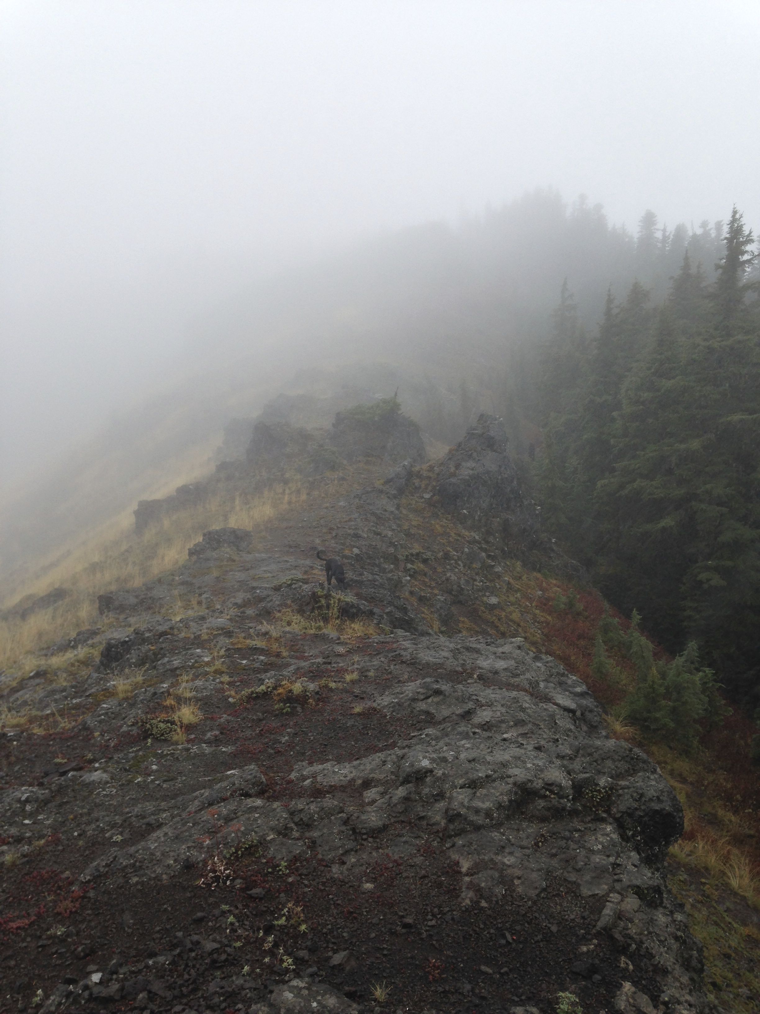 There are several small peak-lets along the ridge. Traverse to the left of the first one. The rest may be climbed or skirted depending on your level of comfort. I suspect the vistas from the ridge are pretty great, but on this day, the visibility was very poor, often less than a hundred yards.