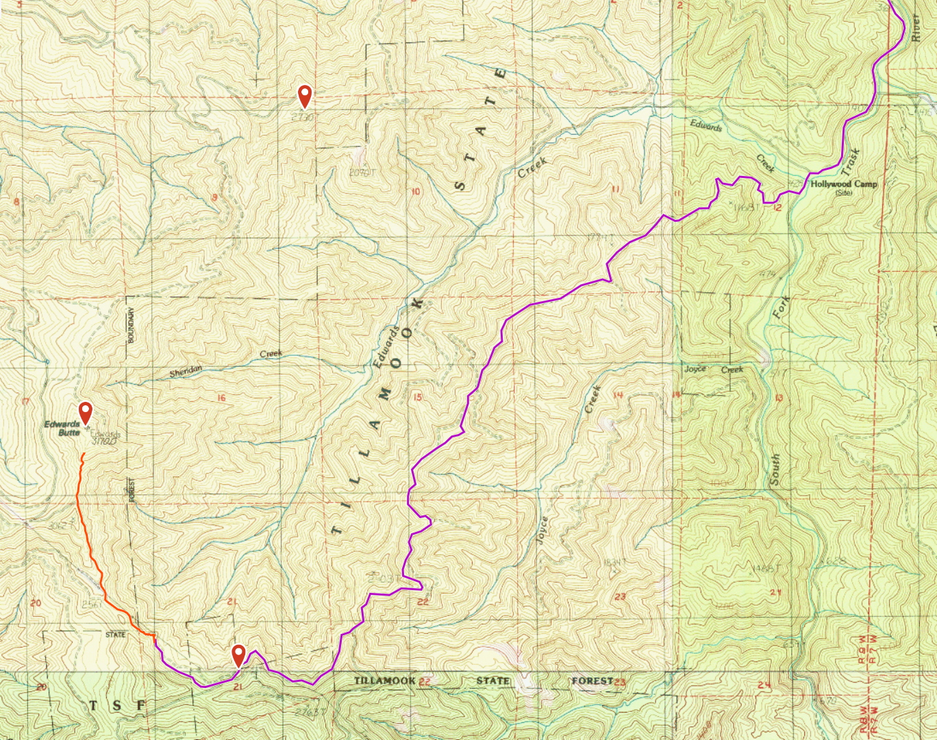 The best driving route goes out to Tillamook and then back into the state forest along Trask River Road. Until around the Trask River Campground this road is paved and pleasant. Shortly after the campground it turns into gravel forest road, some of which have significant climbs. The entire route is passable without much difficulty in an AWD vehicle, but probably not a good idea on 2WD. Topo routing software made for a straightforward journey without any surprise re-routes; I've included a capture of our driving path below.