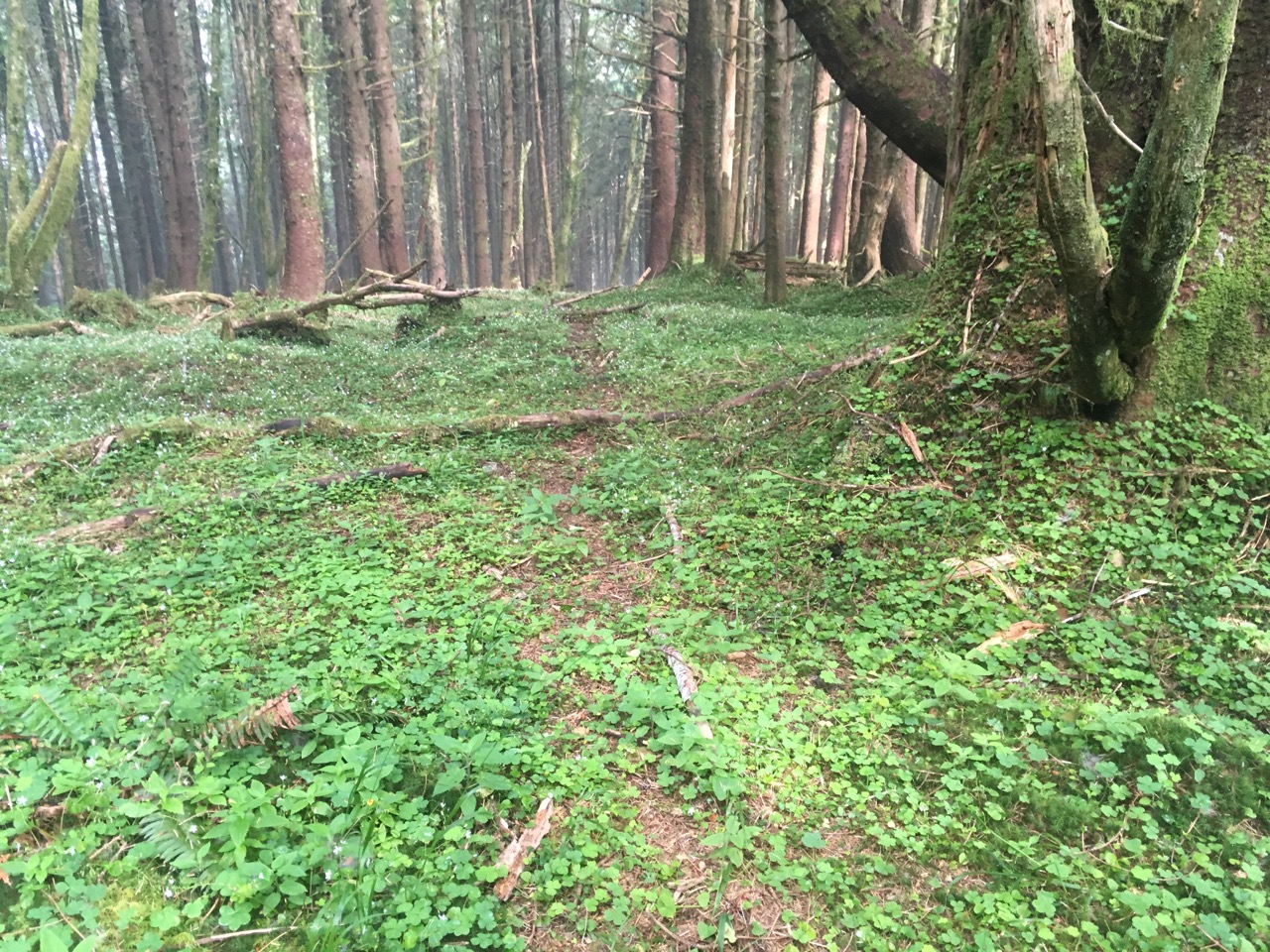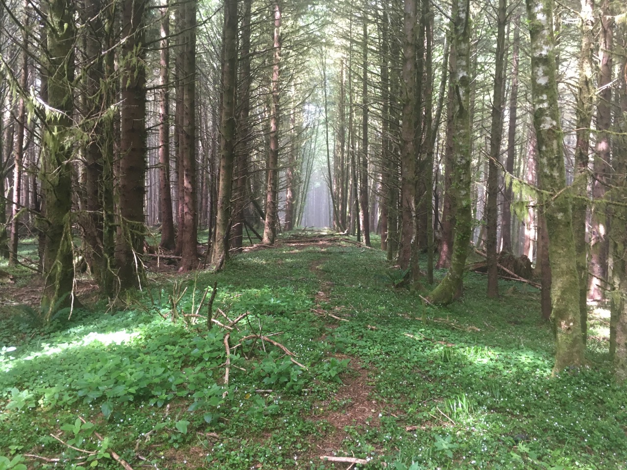 If you choose to take a direct approach: after driving approximately 2 miles, (45.06392, -123.97409) is a good spot to pull off and start an ascent. From here the summit is only about 500’ away with 150’ elevation to cover. There are various hints of trails but they’re hard to follow all the way up and not really necessary anyway. The forest is old and open with a high canopy and very little in the way of undergrowth plants, but various downed and rotting trees are scattered about. Boots would be a good idea on this route as the forest floor is sometimes soft and peat-like. I often sunk a foot in, almost like walking in unpacked snow. However the ocean mist or fog in the area makes most of the ground cover wet, so you might end up with soaked feet. Ask me how I know.