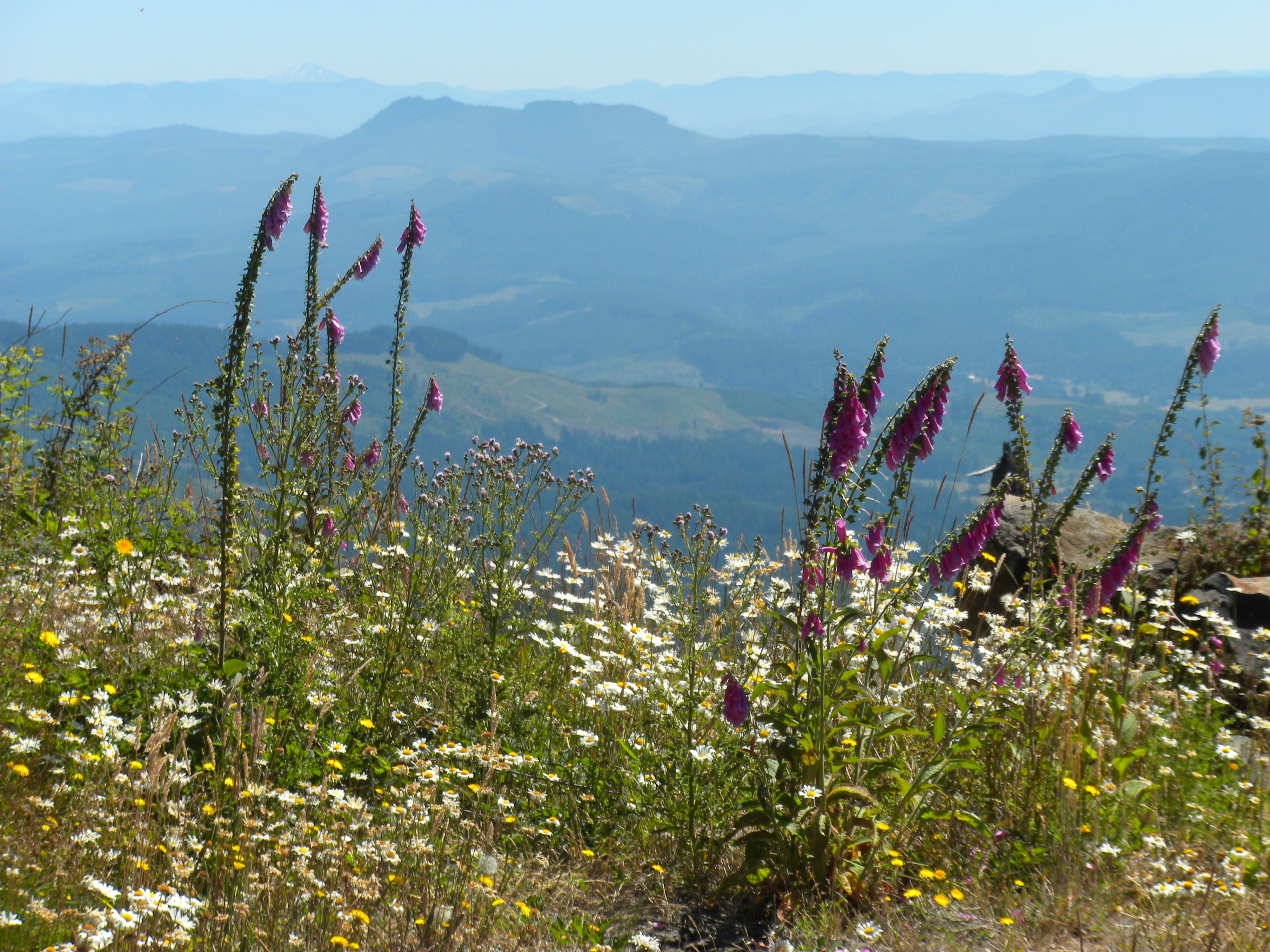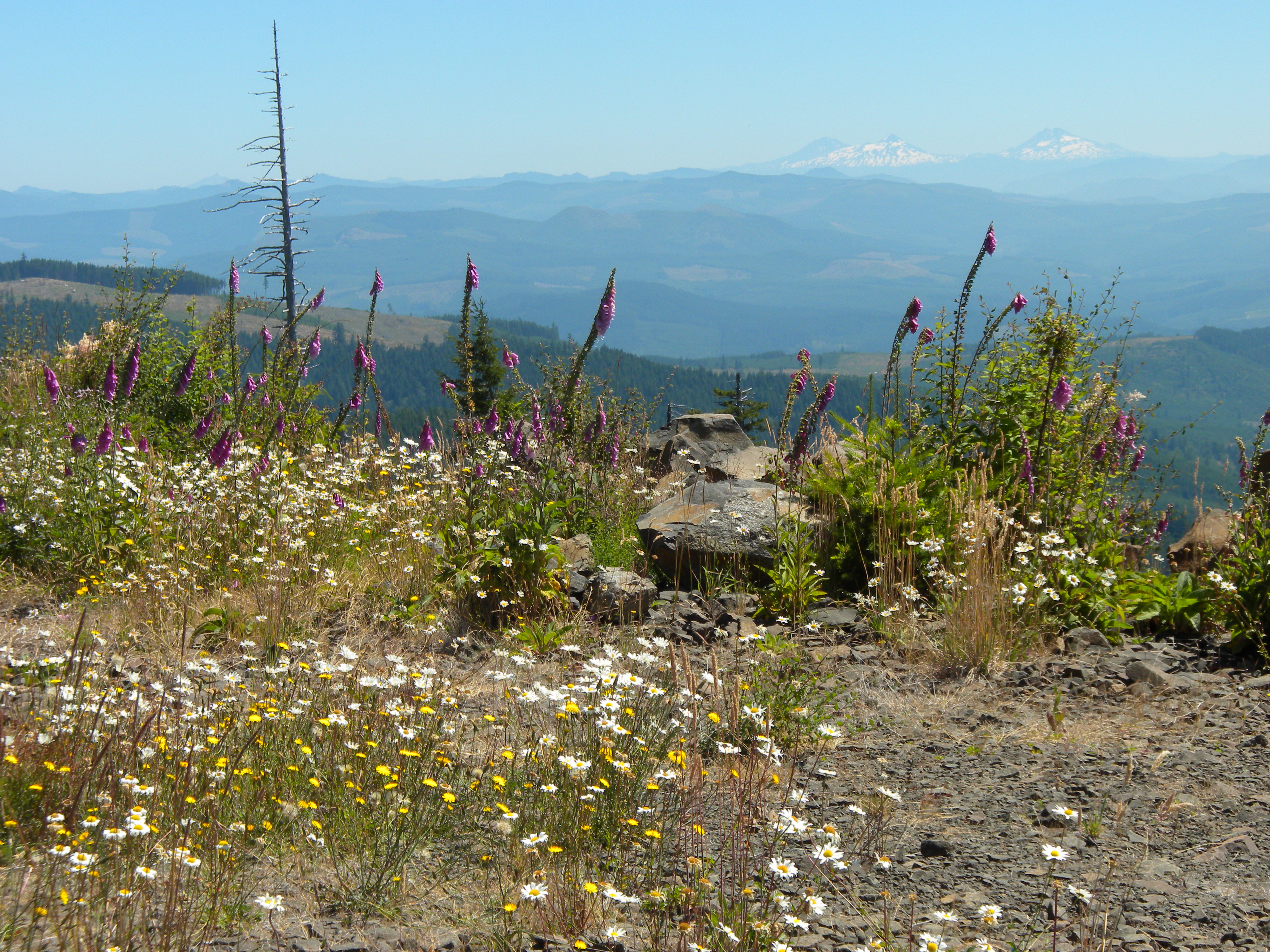 Take the fork to the north and follow it to the summit.  The drive is about 40 mins from the Mohawk Store.  The Buck Mt trailhead is about 25 mins form the store. You can probably drive all the way to the summit if you choose.  There is an old gate about 600 meters from the summit, but it did not look recently used.  There is a place to pull over and park short of the summit, allowing a SOTA walk-up.  The views are impressive with a number of snow covered Cascade peaks to the east and the Eugene valley to the southwest.  The wildflowers and butterflies were impressive, especially the great number of purple foxgloves in high form.  Of the two summits, Mt Tom is the nicer: better views, more flowers, no QRN.